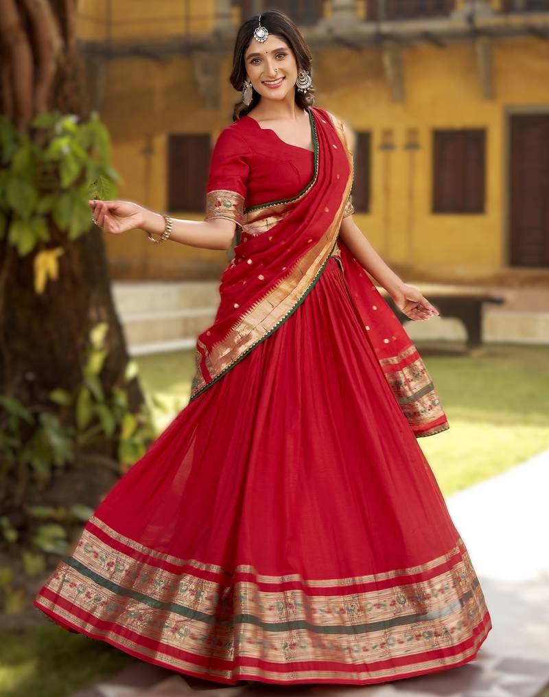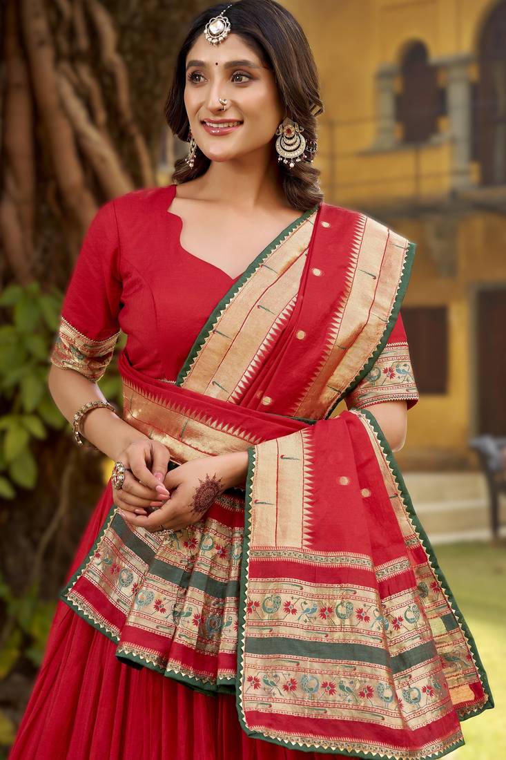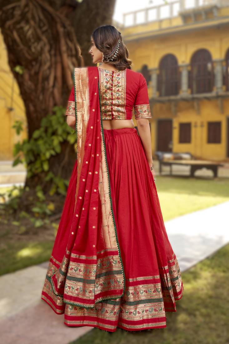 Red paithani style pure chanderi zari weaving lehenga choli with dupatta ready made (32 to 42)