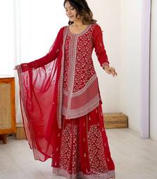 | Product Name | Red Premium Faux Georgette Embroidered Top Palazzo Set With Dupatta – Festive & Party Wear Suit | |