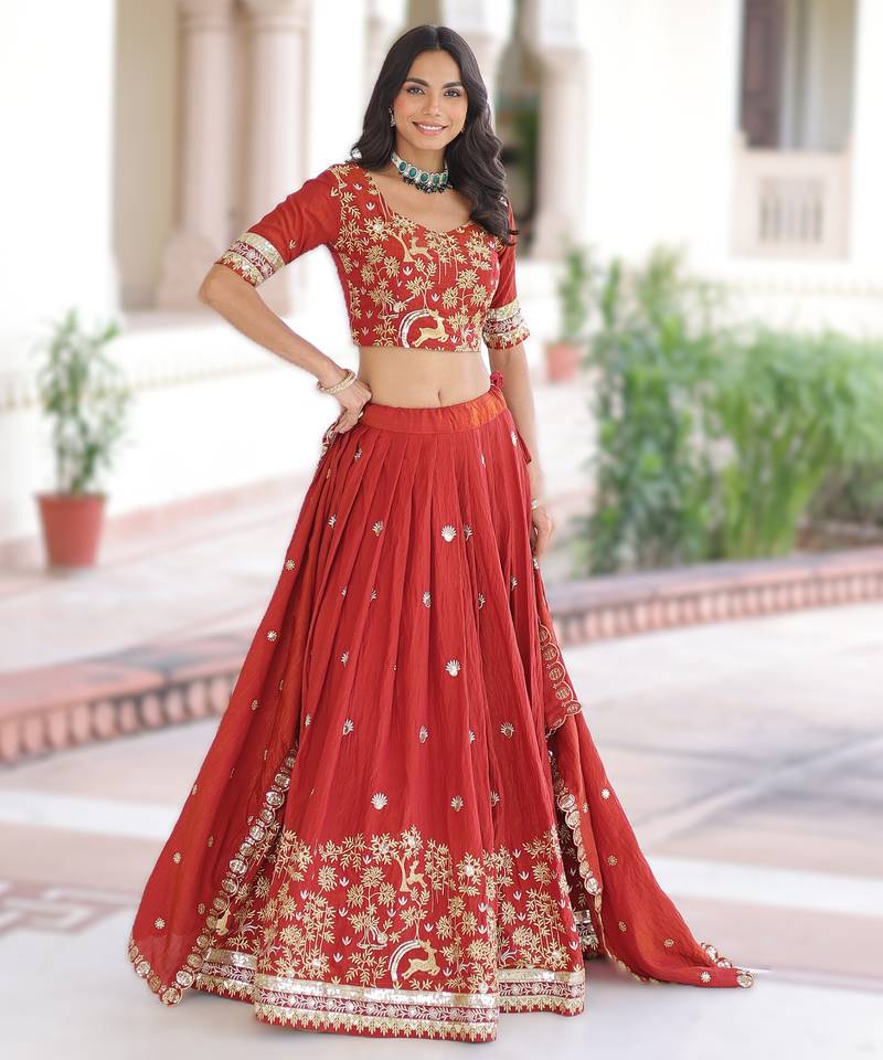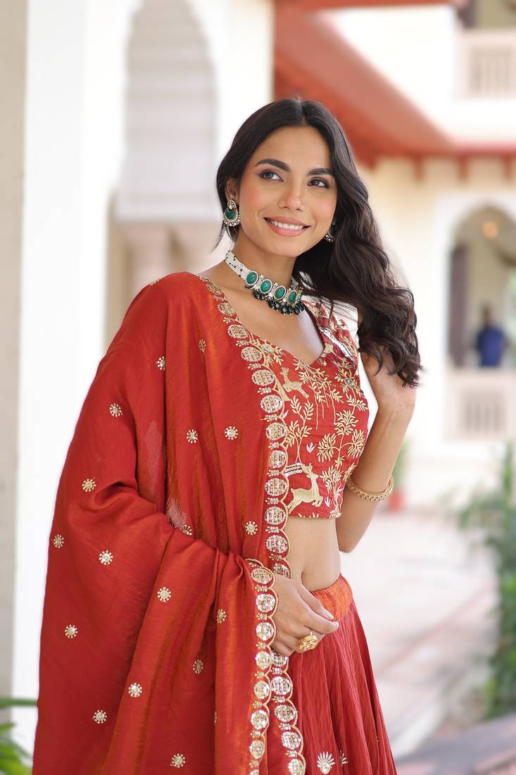 Product Name Red Vichitra Silk Sequins & Thread Embroidered Lehenga Choli With Designer Lace Dupatta