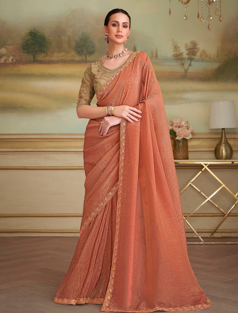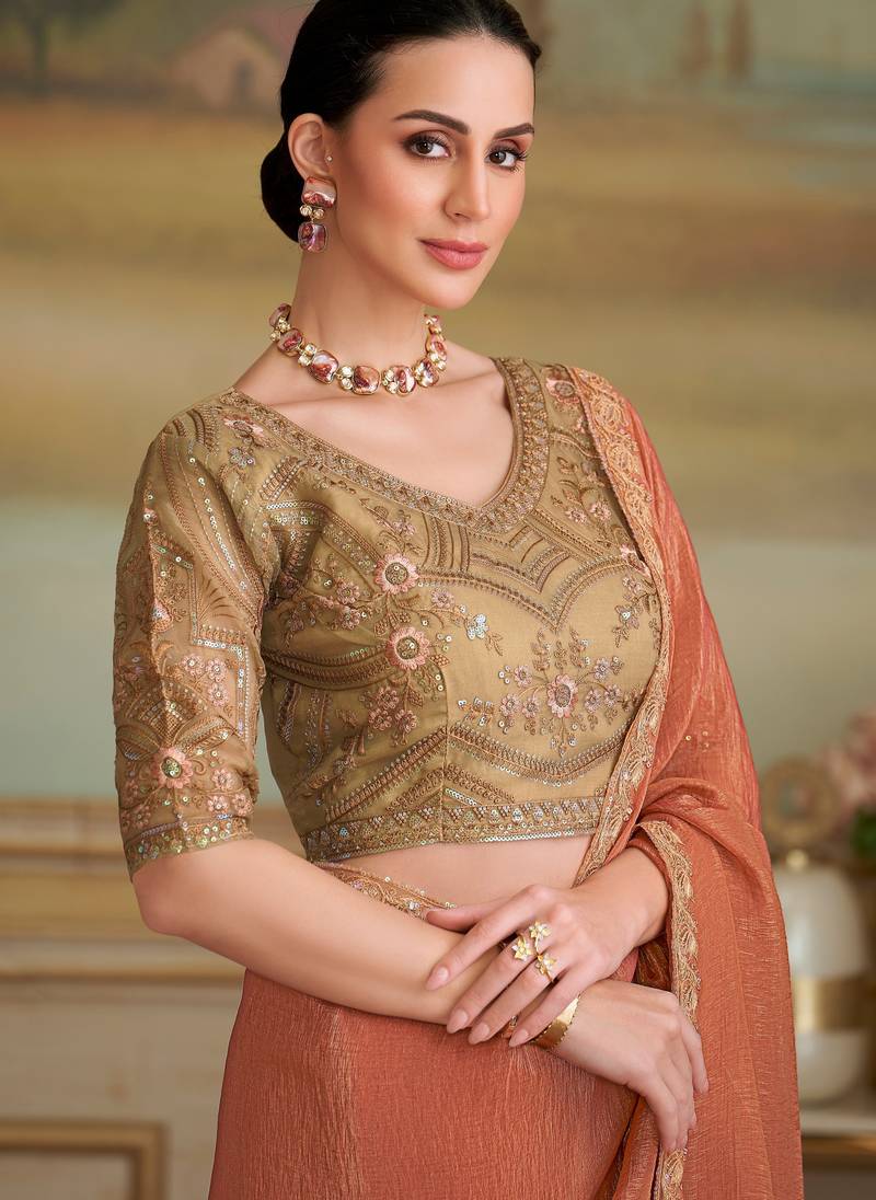 Rust orange gold georgette saree with tussar silk blend blouse