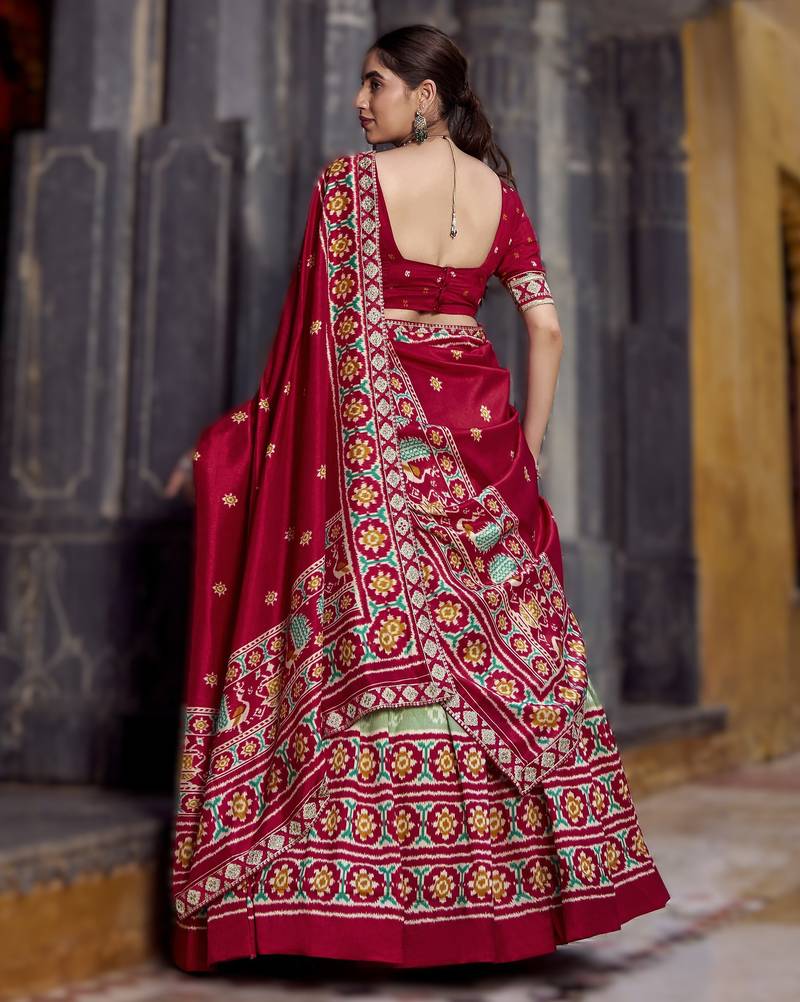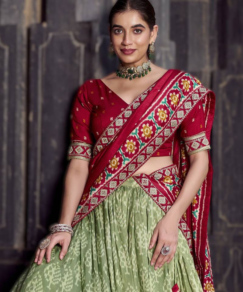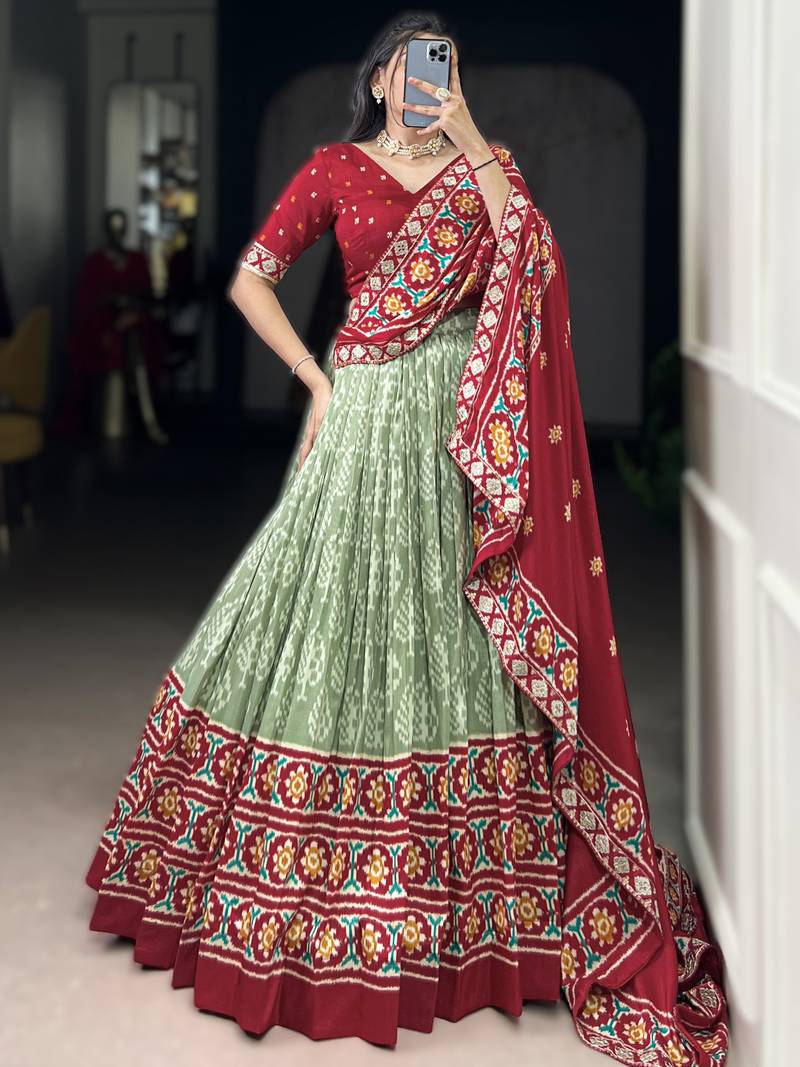 | Product Name | Sea Green Tasar Silk Ikkat Printed Lehenga Choli Set With Embroidered Blouse & Dupatta | |