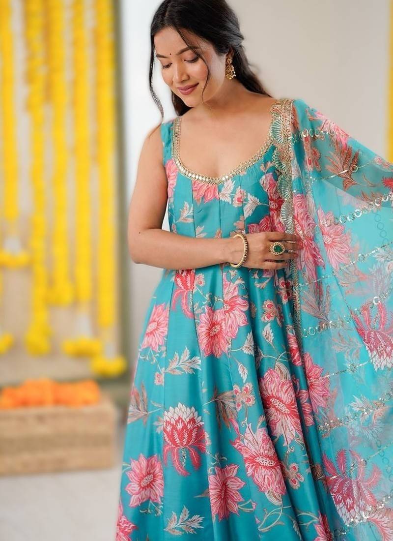 | Product Name | Sky Blue Floral Print Straight Kali Cut Anarkali Suit | |