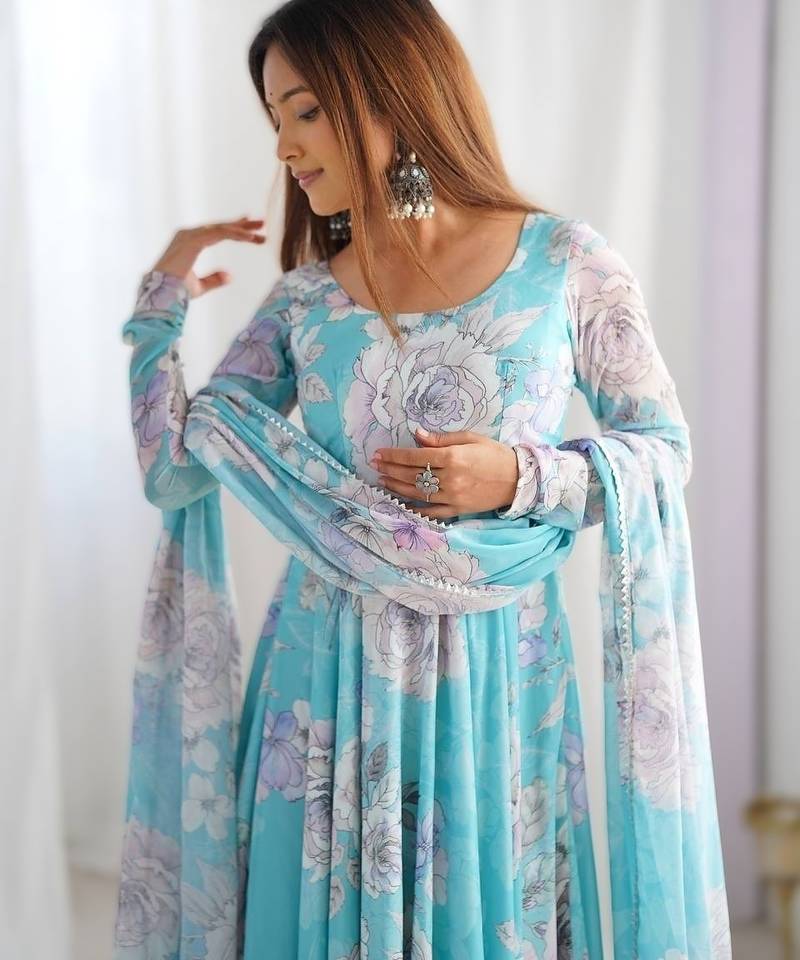 | Product Name | Sky Blue Colorful Floral Print Fox Georgette Anarkali Gown Set With Dupatta | |