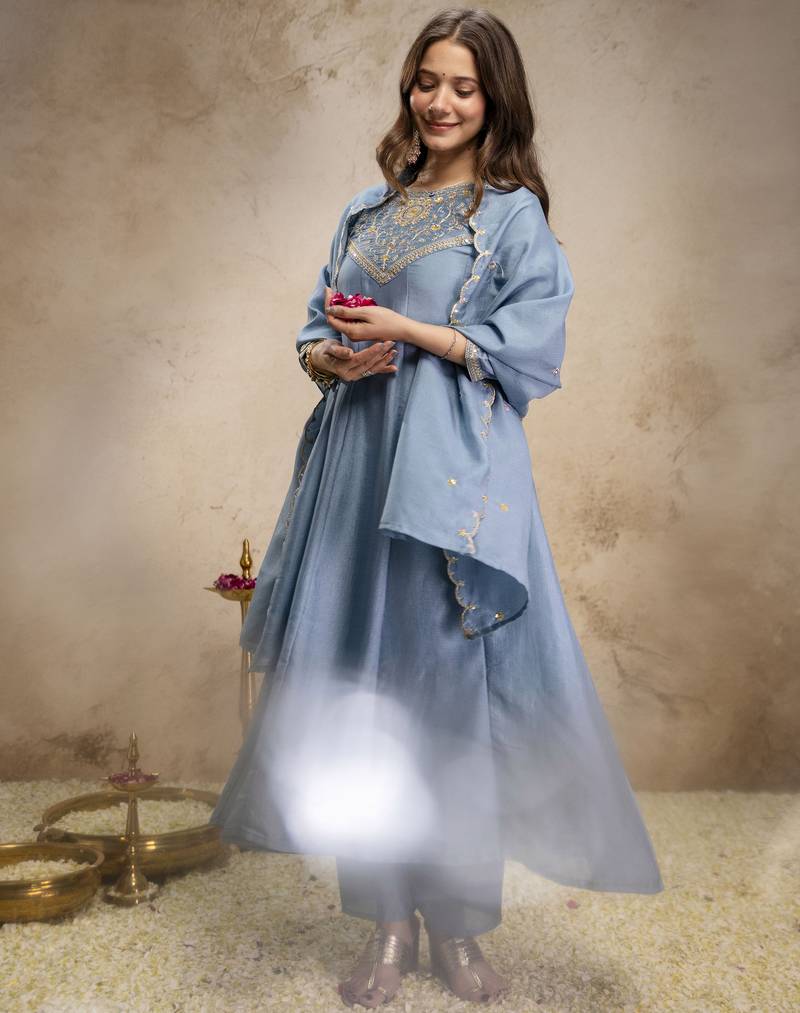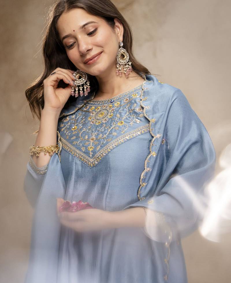 Skyblue color women’s embroidered vichitra silk anarkali kurta set with dupatta – flared ethnic suit for festive stitched