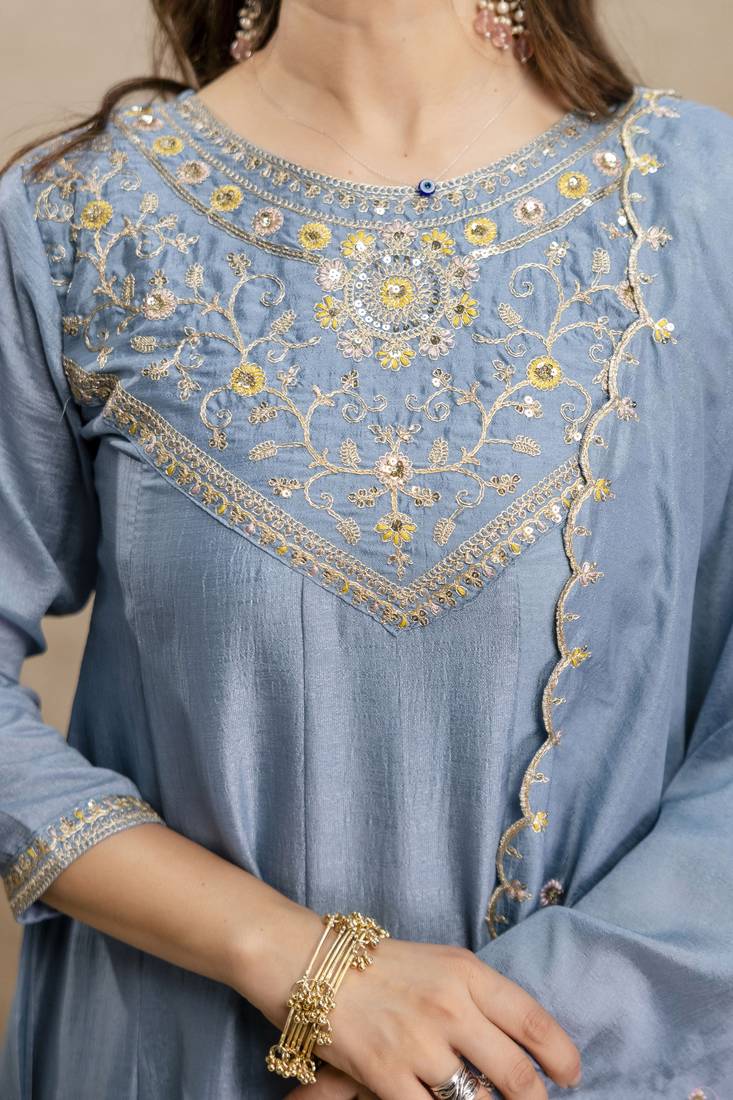 | Product Name | Skyblue Color Women’s Embroidered Vichitra Silk Anarkali Kurta Set With Dupatta – Flared Ethnic Suit For Festive | |