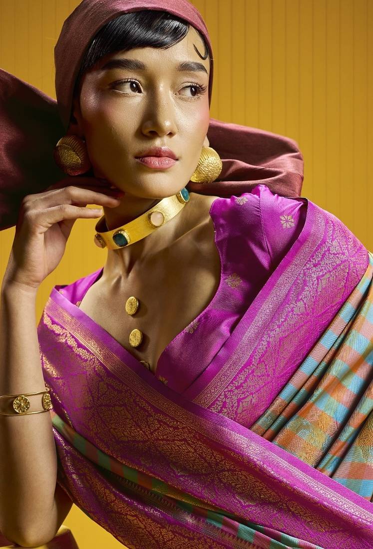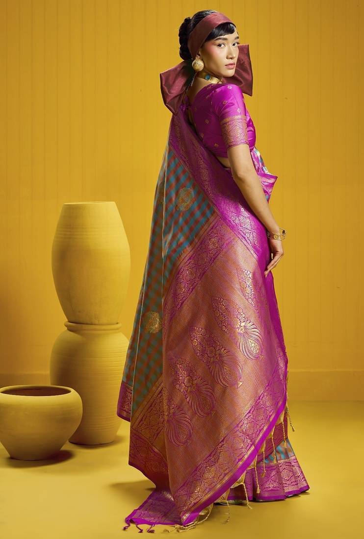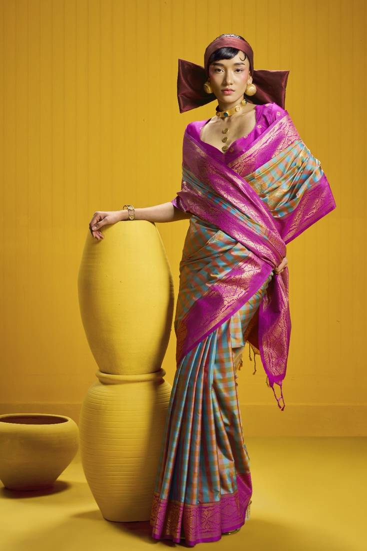Traditional handloom pure silk saree with checks pattern & matching blouse