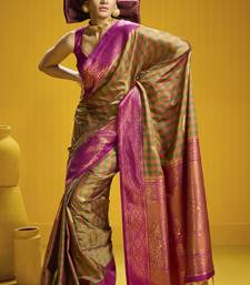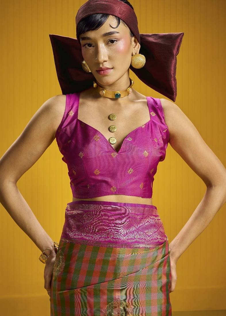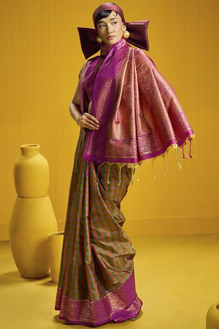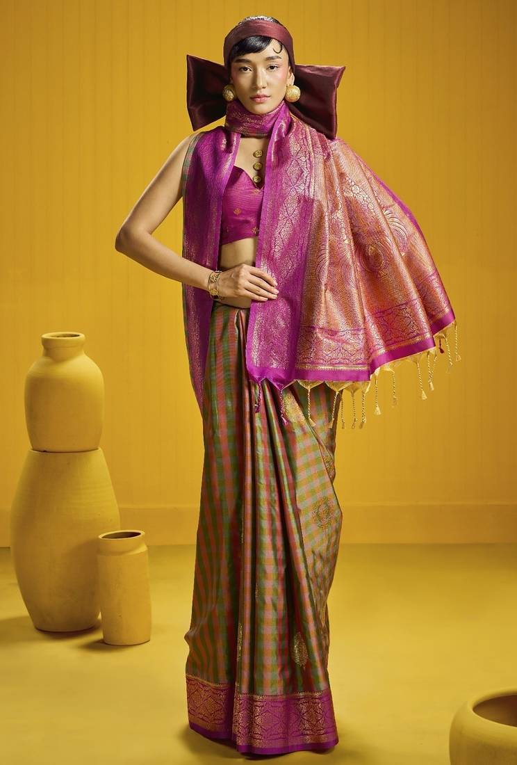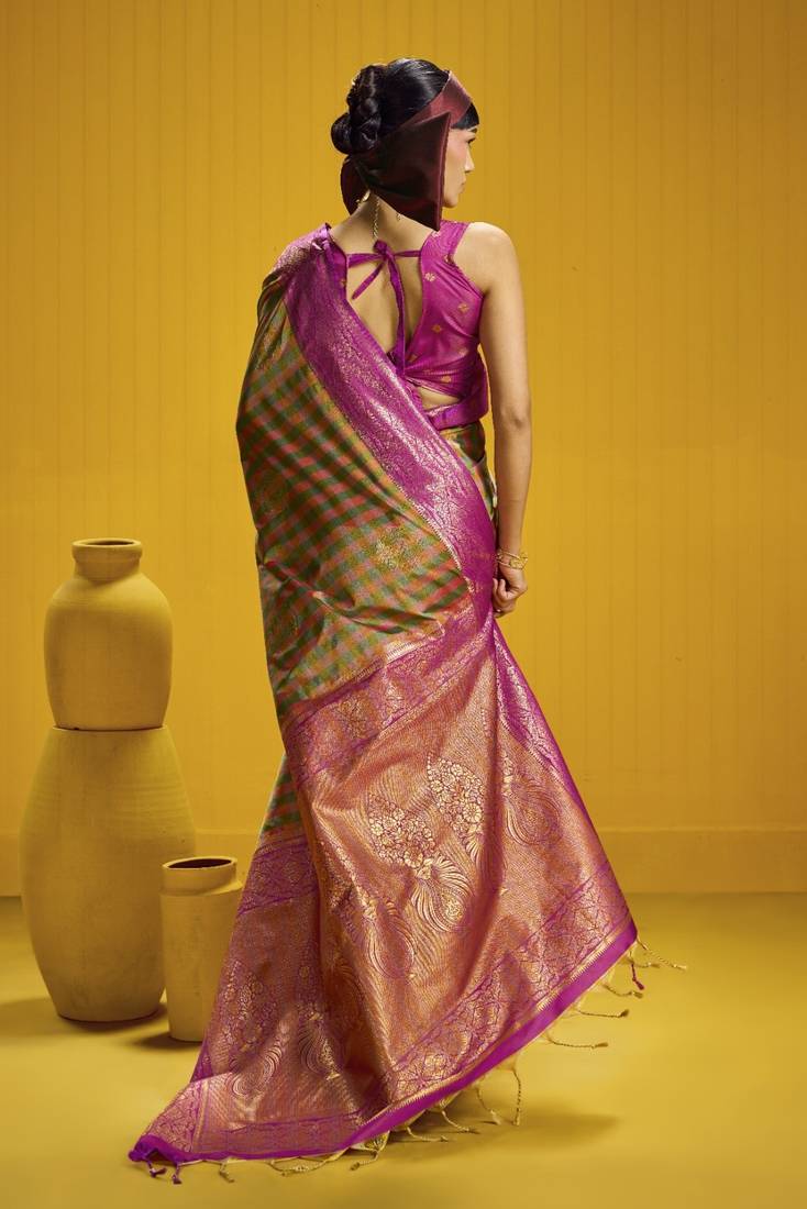 Traditional handloom pure silk saree with checks pattern & matching blouse