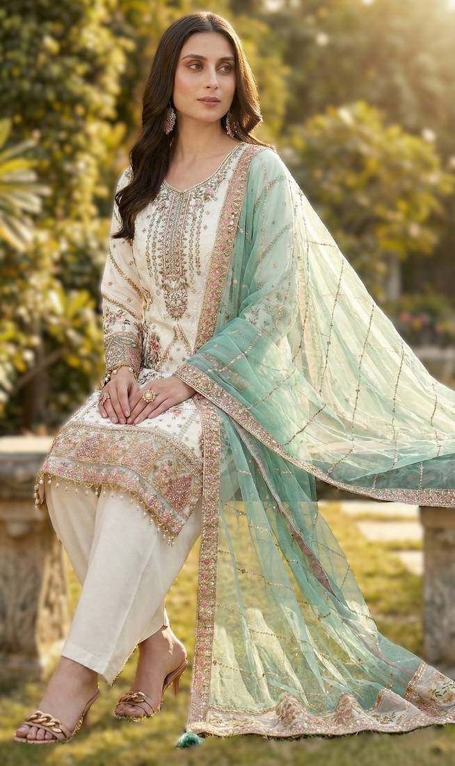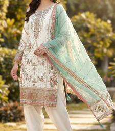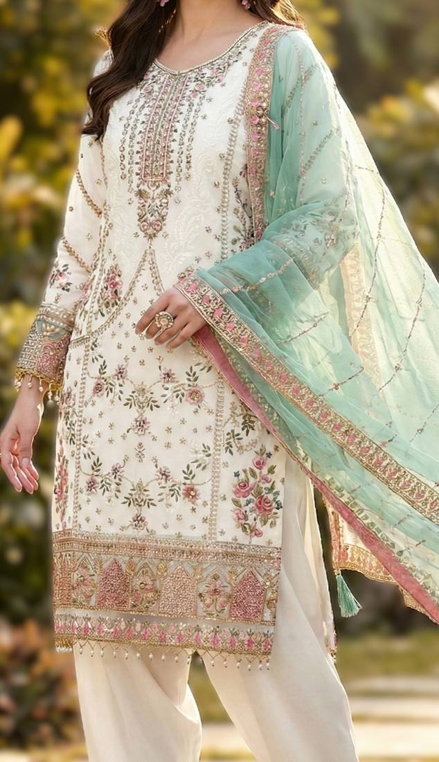 White pakistani style royal salwar kameez wear – embroidered fox georgette set semi stitched