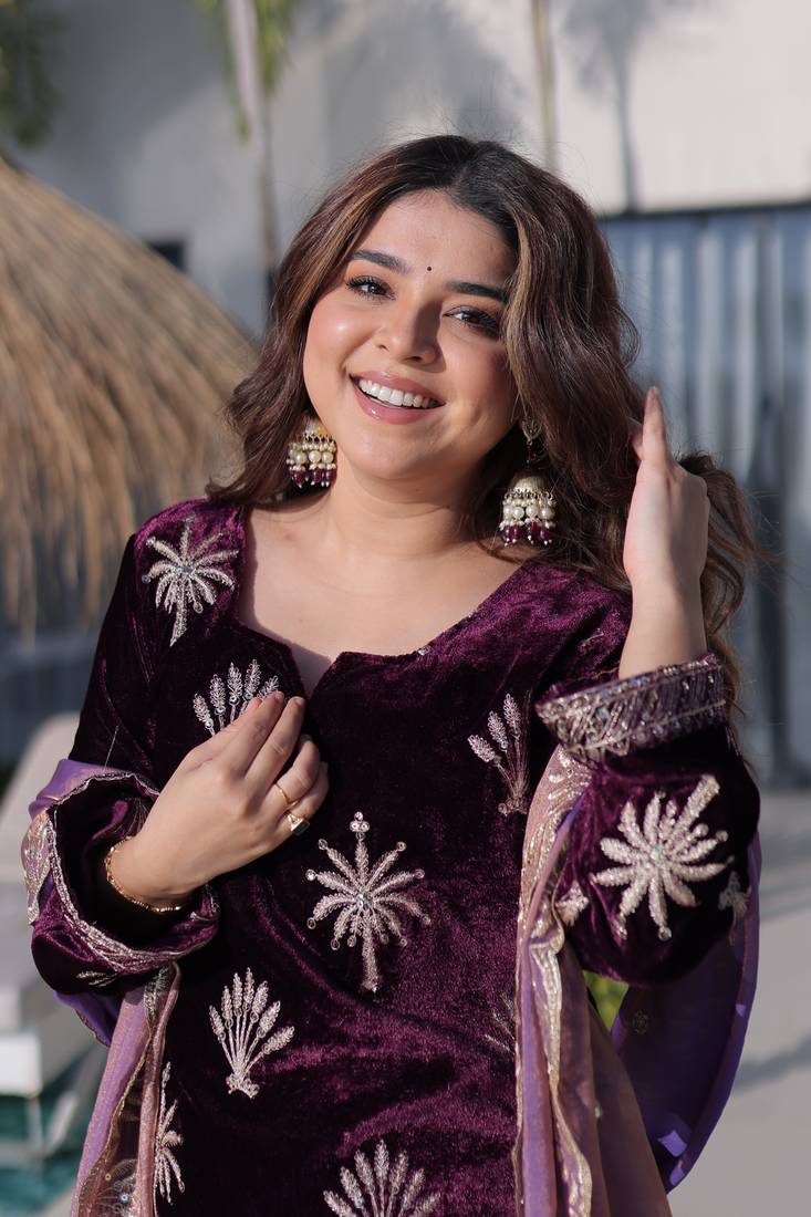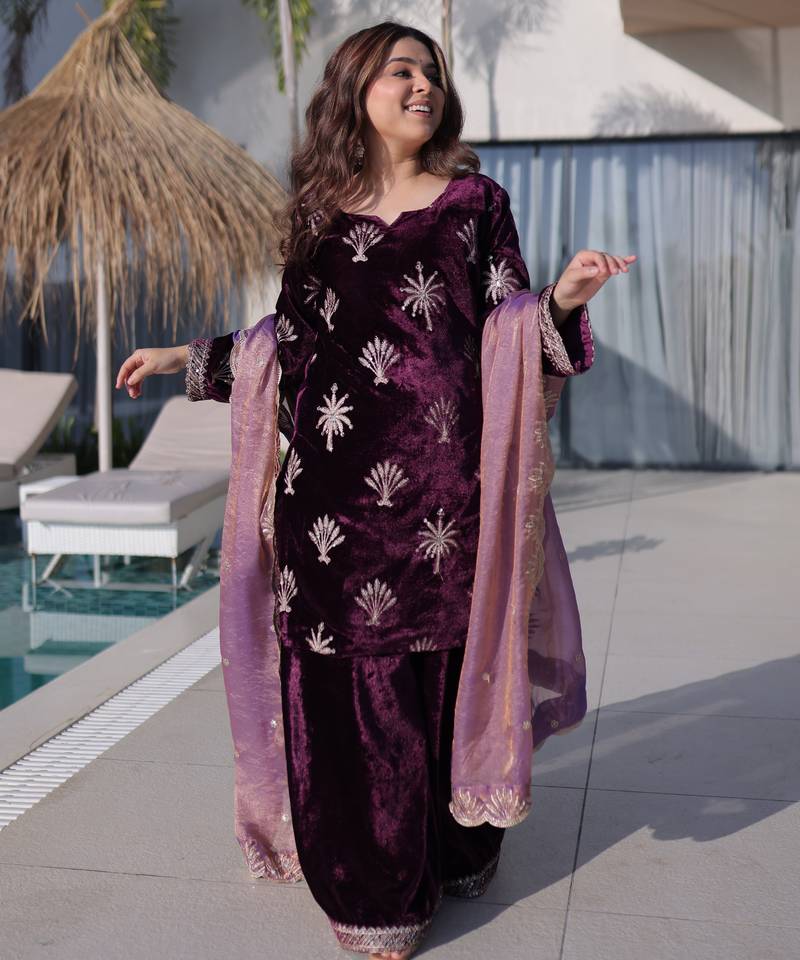| Product Name | Wine Premium Ice Velvet Kurti Palazzo Set With Sequins Embroidered Fendi Dupatta – Party Wear Ready Made | |