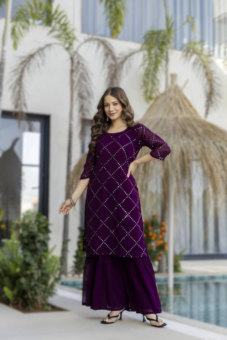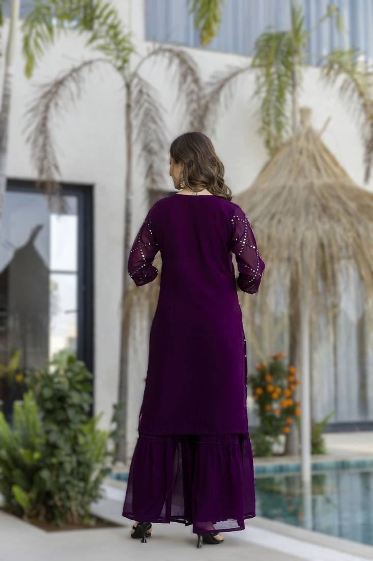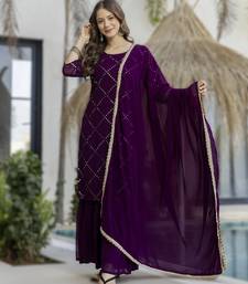 Wine women's wine embroidered georgette kurta with sharara pant & lace dupatta se stitched