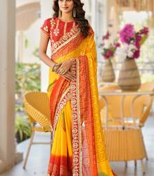 yellow fancy print bandhani saree heavy moss chiffon with heavy work blouse