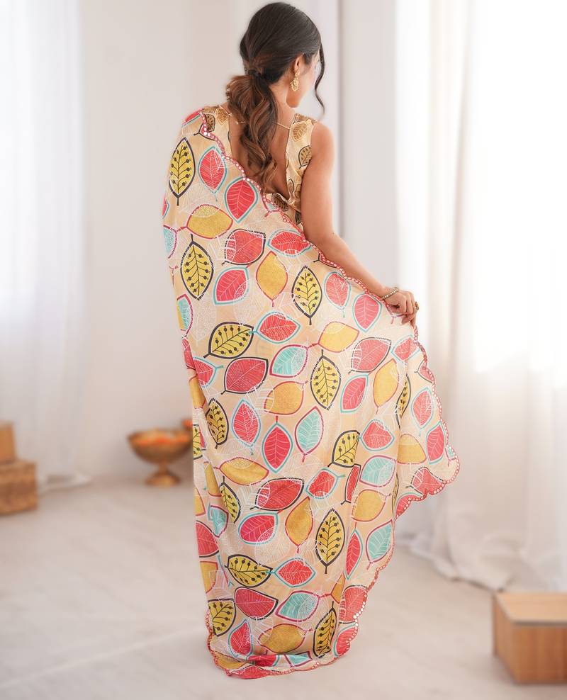 Yellow heavy chinon printed saree with mirror work border