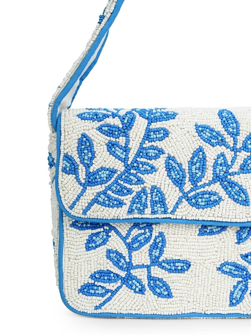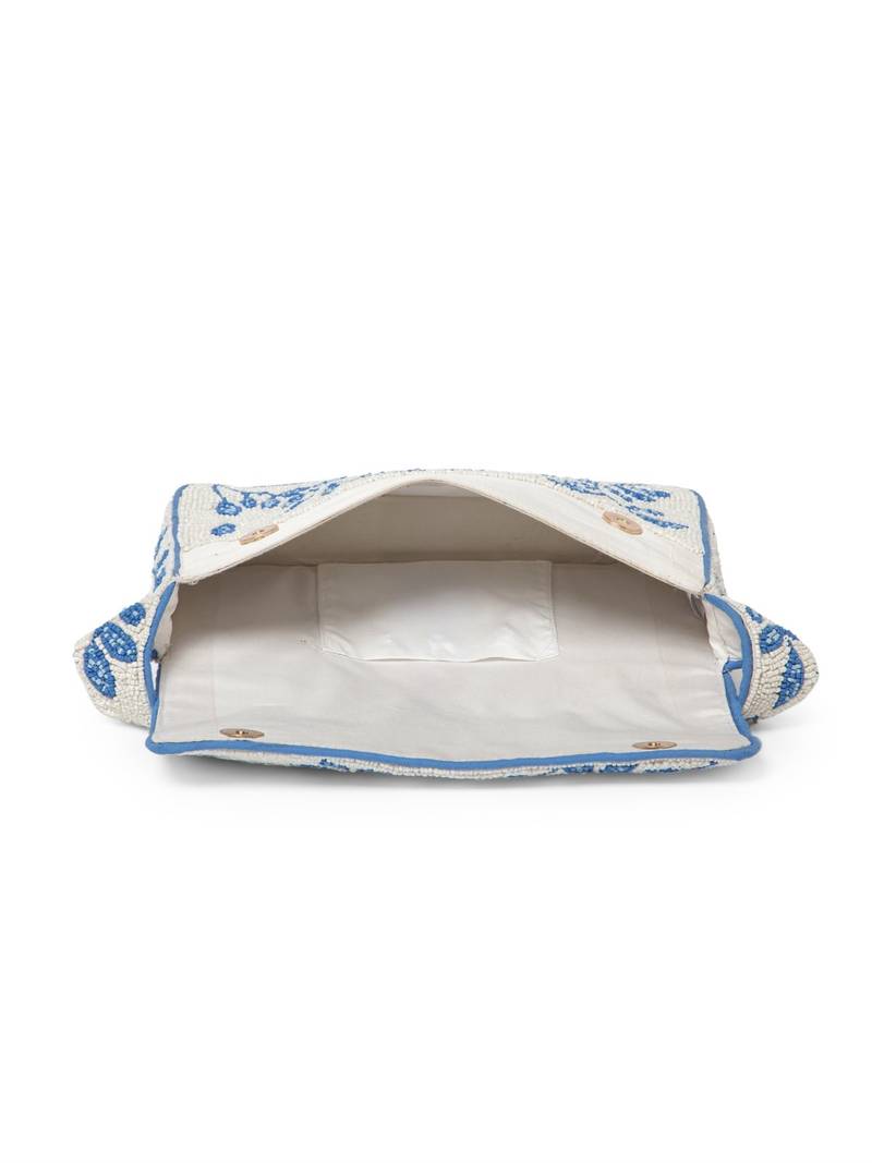 This Anekaant Clutch From The Beaded Botanica Collection Features A Main Compartment Secured With A Magnetic Button Closure. Styled On An Ivory Base With Royal Blue Accents, It Offers A Sophisticated Botanical Aesthetic.