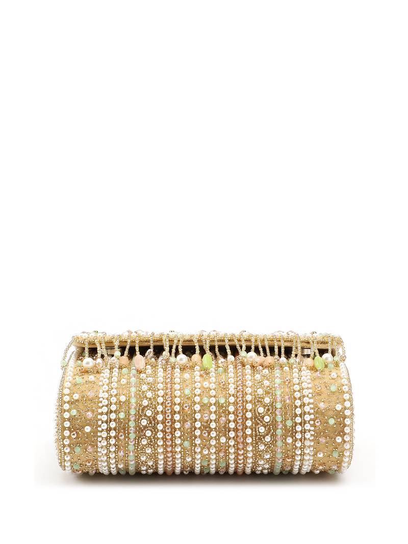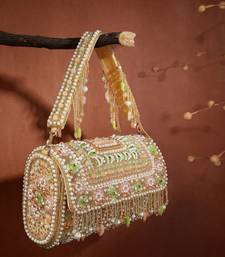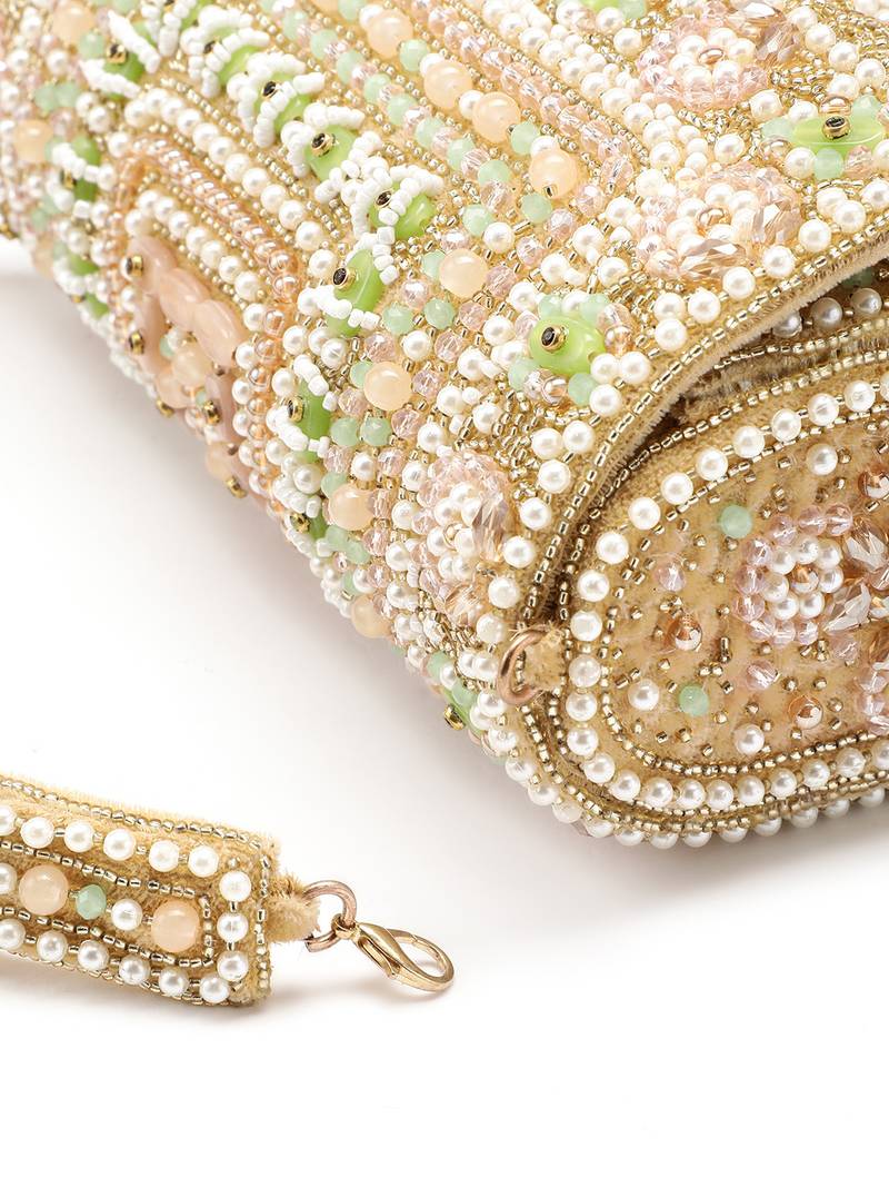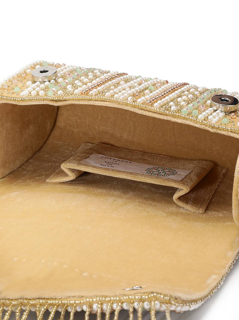 The Anekaant Beige & Pearl White Clutch From The Blush & Bead Collection Is A Sophisticated Foldover Accessory Crafted From Plush Velvet With A Soft Inner Lining. Accented With Champagne Pink And Mint Green Tones, The Neutral Base Is Elevated By Delicate Pastel Detailing. The Surface Features A Unique Mix Of Floral And Geometric Motifs, Intricately Adorned With Pearls And Beads. Gold Toned Tassels Add Graceful Movement And A Festive Finish. Designed In A Sleek Rectangular Shape, It Includes One Main Compartment With A Magnetic Button Closure, An Inner Slip Pocket, And A Detachable Embroidered Handle With A Metal Chain For Versatile Styling.