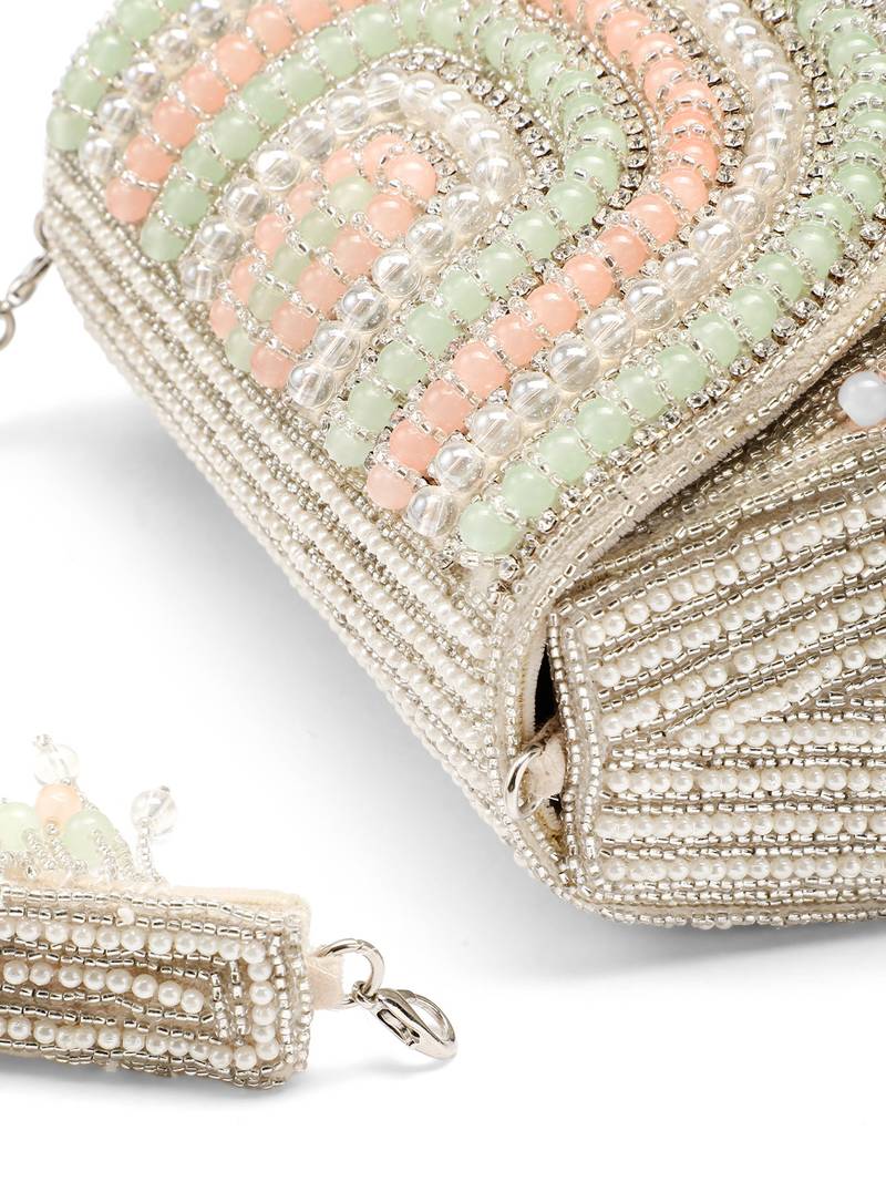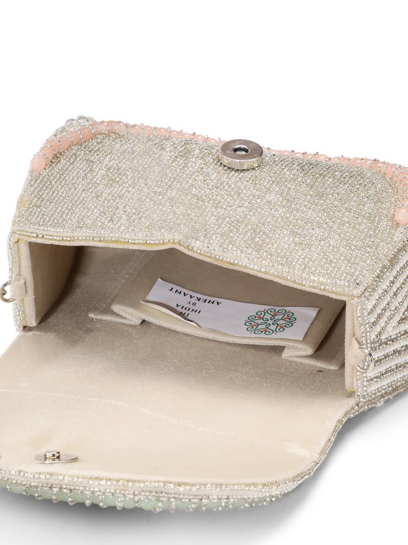 The Anekaant Silver & Pastel Multi Clutch From The Blush & Bead Collection Is A Striking Foldover Accessory That Blends Shimmer With Soft Sophistication. Crafted From Plush Velvet And Lined For A Smooth Finish, It Features A Luminous Palette Of Silver, Ivory, And Pastel Hues. The Front Showcases A Layered Arch Design, Intricately Embellished With Crystal Beads For A Textured, Dimensional Effect. Secured With A Magnetic Button Closure, It Offers A Single Main Compartment And Includes A Detachable Embellished Handle , As Well As A Metal Chain For Versatile Styling. Dimensions (L X H X W): 18 X 12 X 7 Cm.