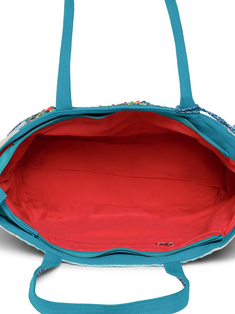 | Product Description | This Anekaant Tote Bag From The Boho Collection Features A Teal Green Base With Beige Fabric Panels, Multicolor Accents, And Seafoam Ivory Tassels With Pom Poms. Crafted From Acrylic Jacquard And Cotton Canvas With A Polyester Lining, It Is Decorated With An Ethnic Wave Pattern Enriched With Beads, Threadwork, Mirrors, And Floral Embroidery For An Artisanal Touch. Measuring 48 X 29 X 16 Cm (L X H X W), The Bag Includes An Inner Zip Pocket, Dual Side Bottle Holders, And A Secure Back Zip Pocket, Making It Both Stylish And Functional For Everyday Use. Style : Boho Tote Bag With 1 Main Compartment And Easy Zipper Closure.