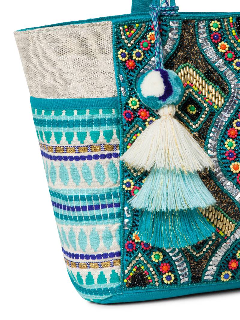 | Product Name | Boho Teal Blue & Multi Acrylic Jacquard Trellis Embellished Tote Bag | |