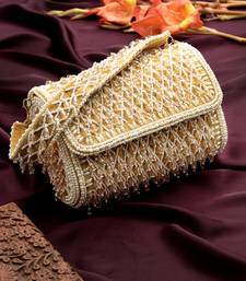 The Anekaant Clutch From The Crystal Cascade Collection Is Designed With A Single Interior Compartment Secured By An Elegant Button Closure, Offering Refined Functionality For Special Occasions. Finished In A Champagne Gold Base, The Design Is Embellished With Ivory And Crystal Toned Beadwork For A Luminous, Sophisticated Appeal. Crafted In Rich Velvet Fabric And Complemented By A Matching Suede Lining, The Clutch Delivers A Plush, Premium Feel. The Exterior Features An Elegant Lattice Pattern, Enhanced With Pearl And Crystal Detailing That Adds Depth And A Graceful Shimmer. Equipped With An Inner Slip Pocket For Essentials And A Detachable Handle, This Clutch Allows Effortless Styling For Evening Events And Celebrations. Dimensions (L × H × W): 19 × 13 × 7 Cm.