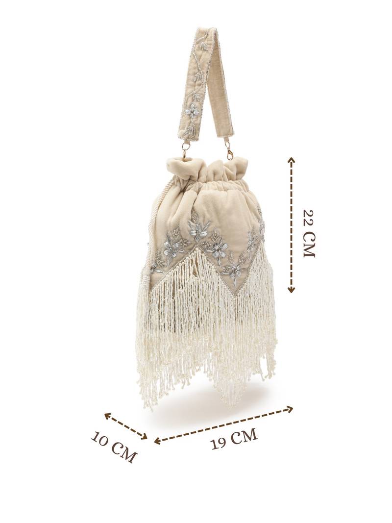 Product Description | The Anekaant Ecru & Ivory Potli From The Dewdrop Fringe Collection Is A Refined Blend Of Heritage Craftsmanship And Contemporary Elegance. Made From Plush Velvet With A Soft Inner Lining, It Features A Metallic Silver Embroidered Base Accented With Subtle Ivory Detailing. The Surface Is Adorned With Floral Zari Work And Finished With A Deep V Shaped Fringe Embellished With Beads, Adding Graceful Movement And Charm. It Includes A Single Compartment With A Drawstring Closure And A Detachable Embroidered Handle For Versatile Styling. Dimensions (L X H X W): 19 X 22 X 10 Cm. |