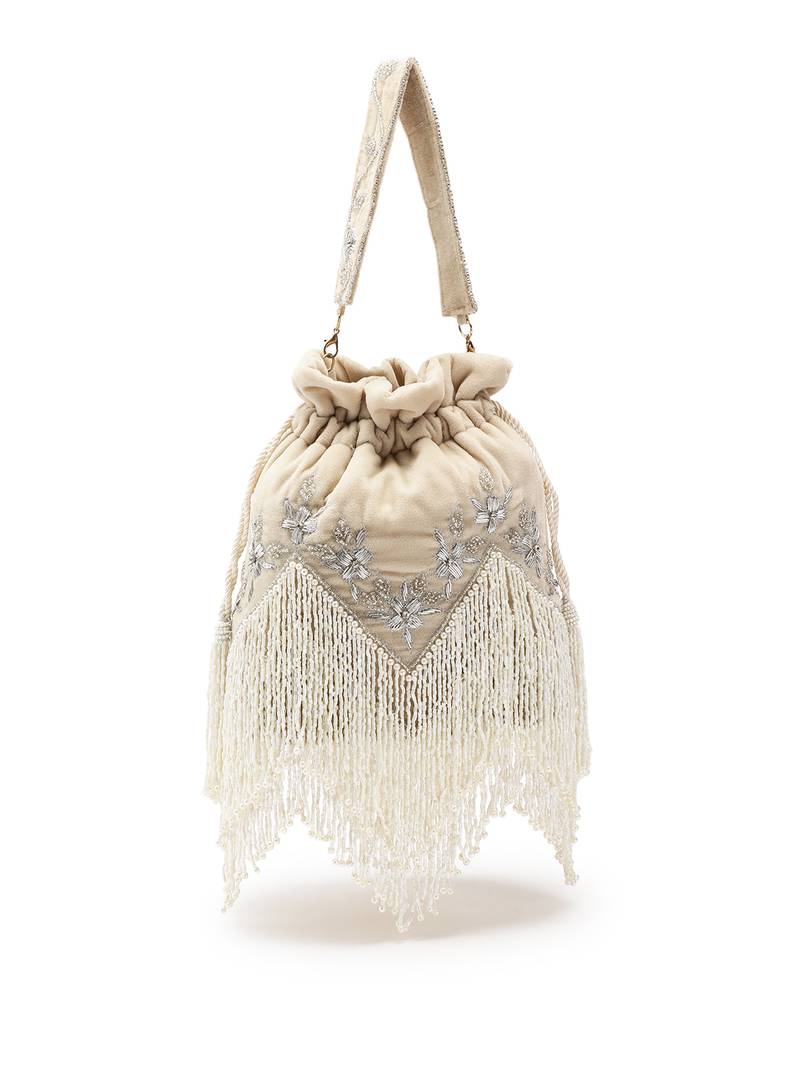 Dewdrop fringe ecru & ivory floral zari embroidered velvet potli