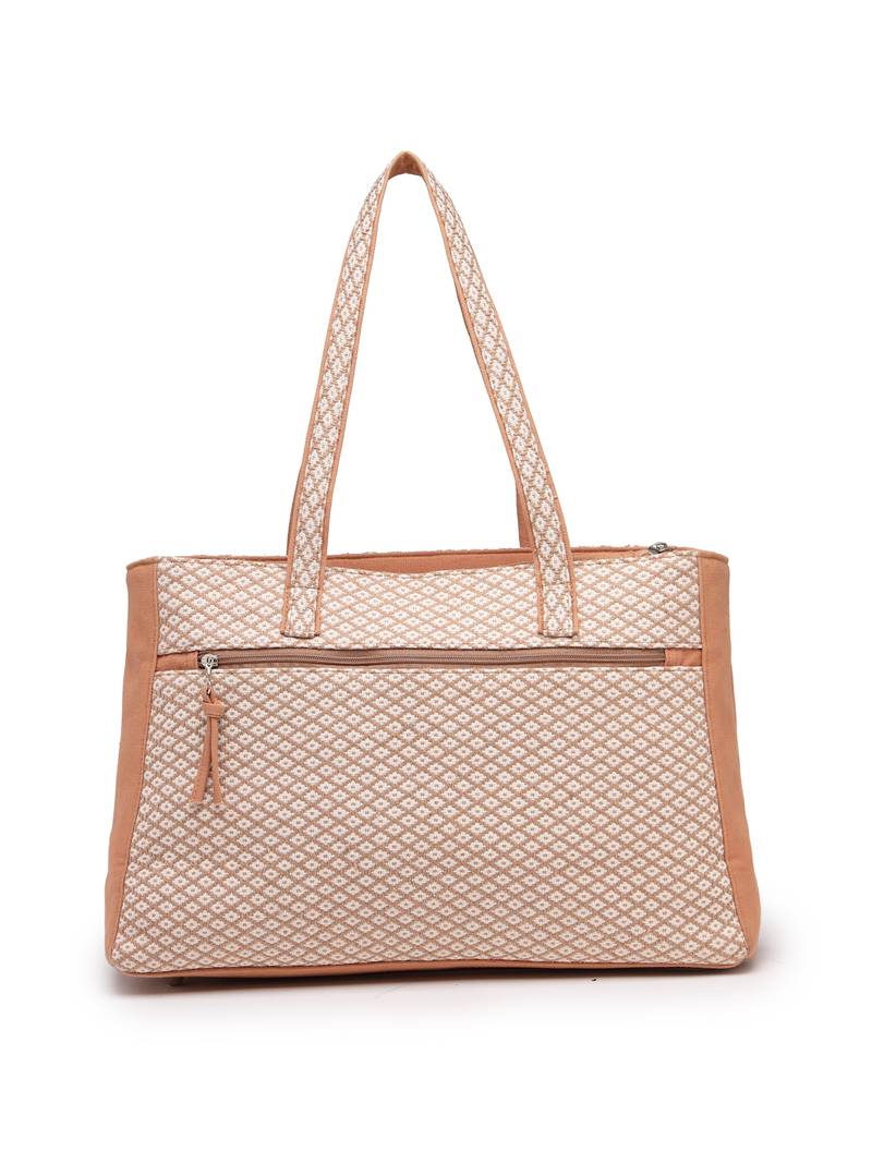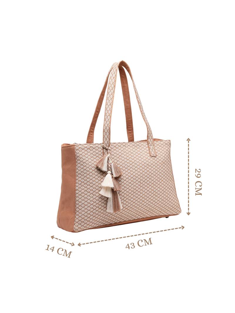 This Anekaant Tote Bag From The Earth Edit Collection Is Designed To Blend Structured Elegance With Everyday Practicality. Crafted In A Soft Beige Palette, It Features Off White Woven Textures Highlighted With Warm Tan Brown Accents, Giving The Bag A Naturally Refined Look. The Structured Geometric Weave, Detailed With Subtle Diamond Patterns, Adds Depth And Character To Its Design. Made From A Durable Combination Of Cotton Jacquard And Canvas, The Tote Is Finished With A Sturdy Polyester Lining To Ensure Long Lasting Use. It Offers A Spacious Single Main Compartment Secured With A Zipper Closure, Along With A Dedicated Tablet/Laptop Compartment That Fits Devices Up To 16 Inches And Fastens Securely With A Velcro Closure.Thoughtful Storage Includes Two Inner Slip Pockets For Daily Essentials, One Inner Zip Pocket For Valuables, And A Back Zip Pocket For Quick And Easy Access. Finished With Elegant Lace Trimmed Handles And Coordinated Tassel Accents, This Tote Is Ideal For Work, Travel, And Everyday Carry. Dimensions (L × H × W): 43 × 29 × 14 Cm