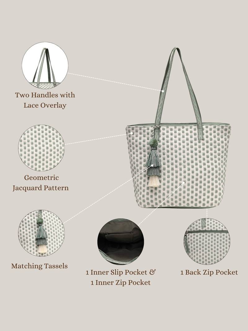 Product Description | This Anekaant Tote Bag From The Earth Edit Collection Is Crafted From Cotton Acrylic Jacquard In A Soft Sage Green And Off White Palette, Offering A Subtle And Refreshing Appeal. It Is Designed With A Spacious Main Compartment Secured By A Zip Closure And Detailed With A Geometric Dotted Jacquard Weave For A Contemporary Touch. The Interior Provides One Slip Pocket And One Zip Pocket For Valuables, While An External Back Zip Pocket Ensures Quick Access To Essentials. Two Lace Trimmed Shoulder Handles Deliver Comfortable Carrying, And A Matching Tassel Adds A Refined Finishing Detail. Dimensions (L X H X W): 29 X 31 X 13 Cm. |