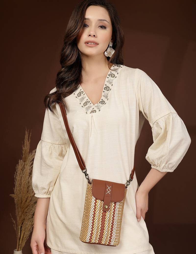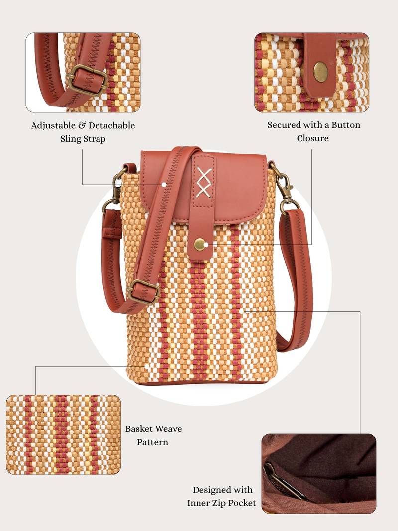 This Anekaant Sling Bag From The Earth Knots Collection Is Thoughtfully Crafted With A Single Main Compartment Secured By A Button Closure, Offering A Compact Yet Functional Design For Everyday Essentials. Styled In A Warm Neutral Palette And Accented With Crisp White Detailing, The Bag Brings An Effortless, Earthy Charm. The Classic Basket Weave Pattern, Highlighted With Alternating Tan And White Stripes, Adds Texture And Visual Interest. Crafted From A Refined Combination Of Raffia And Canvas, The Bag Is Finished With Pu Leather Trims And A Durable Polyester Lining For Lasting Use. Practical Details Include An Inner Zip Pocket For Secure Storage And An Adjustable, Detachable Strap For Comfortable And Versatile Wear. Dimensions (L × H × W): 13 × 20 × 4 Cm