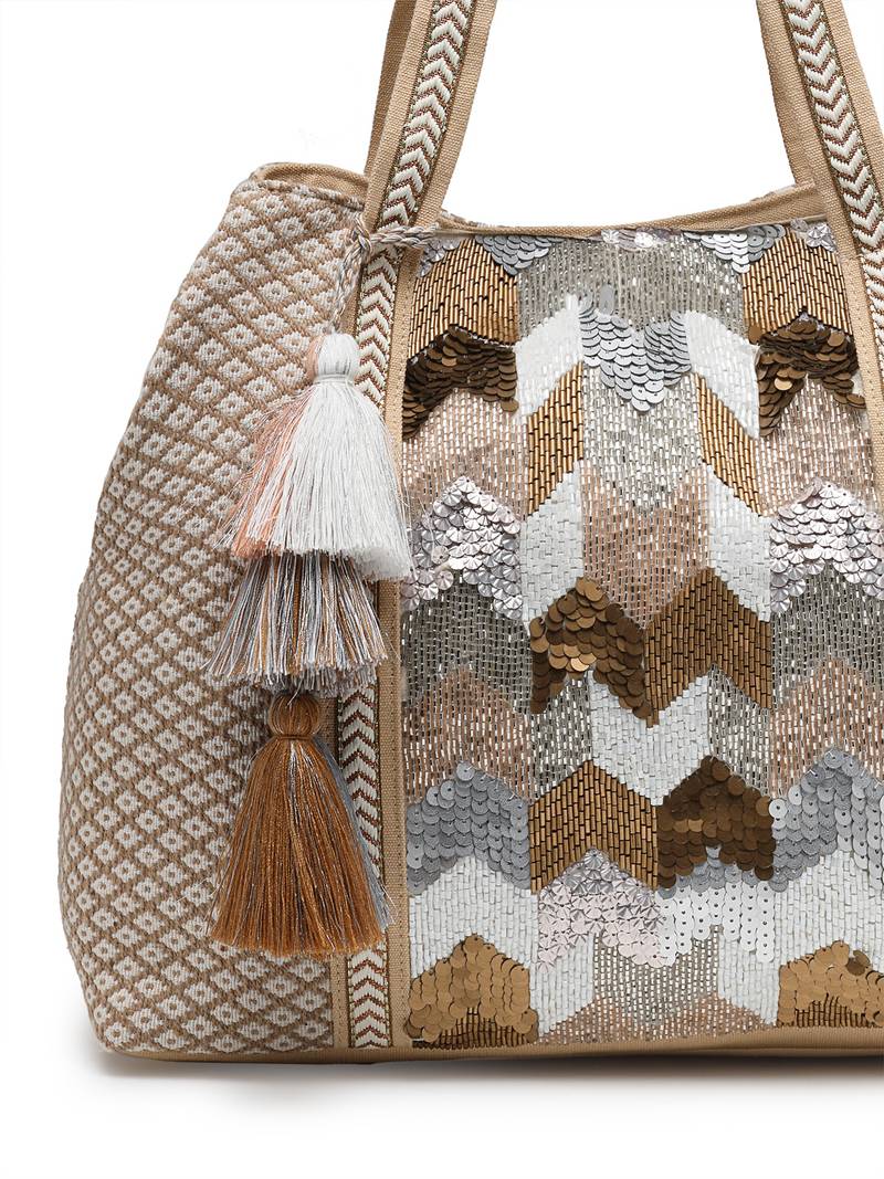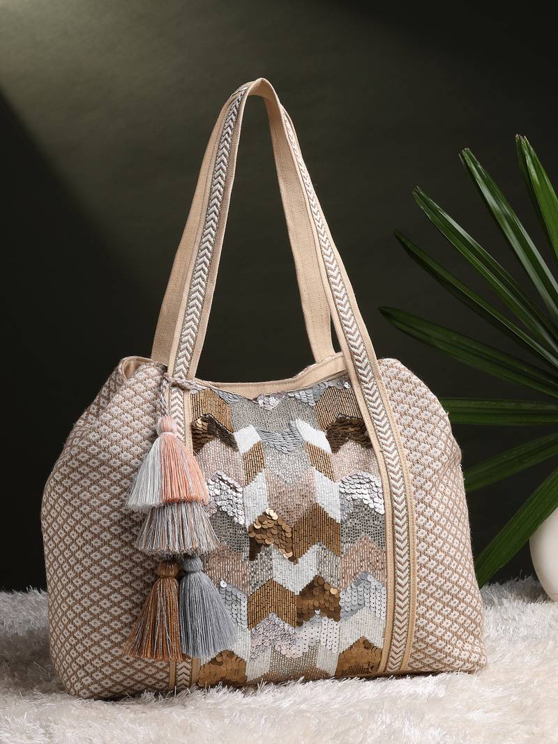 This Anekaant Hobo Bag From The Folklore Edit Collection Is Crafted From Cotton Jacquard In A Beige Base With White Accents, Highlighted By Metallic Shades Of Gold, Bronze, And Silver On The Embellished Panel. The Body Displays A Diamond Jacquard Weave, Complemented By A Central Chevron Mosaic Enriched With Sequins And Beads For A Distinctive Look. Inside, It Offers A Slip Pocket And A Zip Pocket For Valuables, While Lace Trimmed Handles And A Tassel Detail Complete The Design. Dimensions (L X H X W): 36 X 31 X 12 Cm.