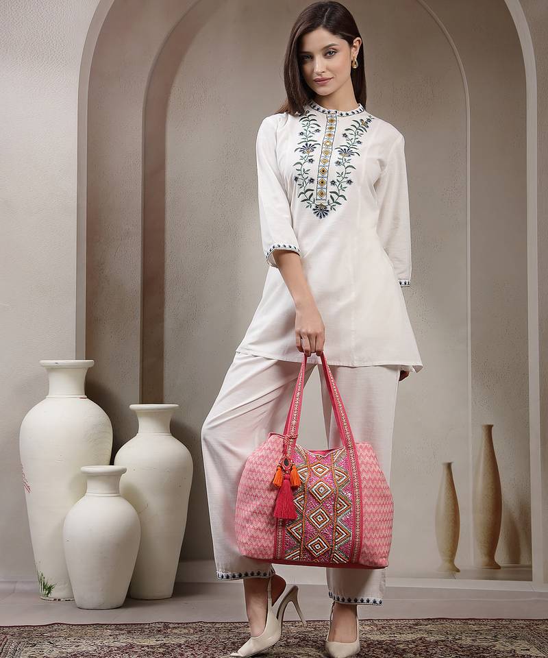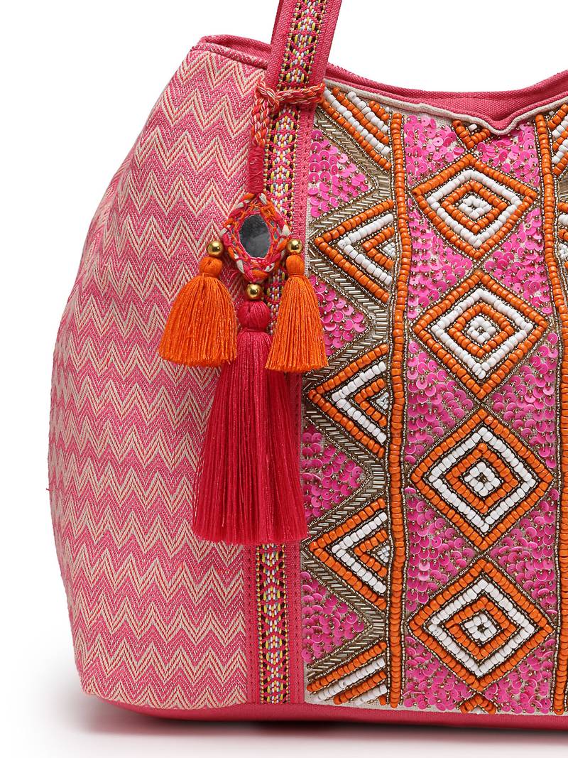 This Anekaant Hobo Bag From The Folklore Edit Collection Is Crafted From Cotton Jacquard With A Bright Pink Base Accented By Orange, White, And Gold. Designed With A Roomy Main Compartment Secured By A Zip Closure, The Front Panel Features Diamond Motifs In Bead Embroidery Highlighted With Sequins For Added Sparkle. The Sides And Back Display A Contrasting Chevron Weave In Pink And Cream, Creating A Stylish Finish. The Interior Includes One Slip Pocket And One Zip Pocket For Essentials, Complemented By Lace Trimmed Shoulder Handles And A Tassel Accent. Dimensions (L X H X W): 36 X 31 X 12 Cm.