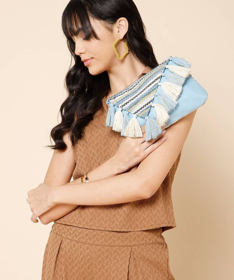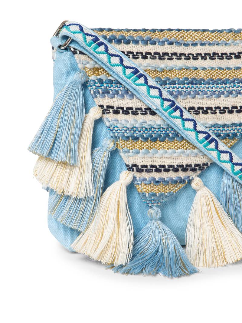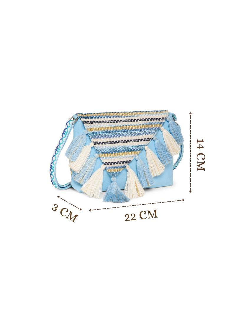 This Anekaant Sling Bag From The Geomat Collection Showcases A Pastel Blue Base With A Matching Strap, Enhanced By Metallic Gold Threadwork For A Subtle Glam Touch. Crafted From Cotton Jacquard Canvas And Finished With A Polyester Lining, It Combines Durability With Style. The Front Flap Is Detailed With A Horizontal Striped Woven Design Finished With Matching Tassels. Measuring 22 X 14 X 3 Cm (L X H X W), The Bag Offers Practical Storage With One Inner Zip Pocket And One External Zip Pocket For Easy Organization.