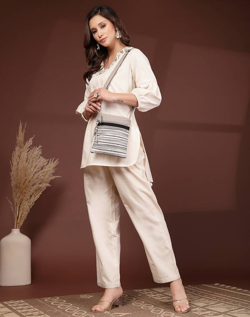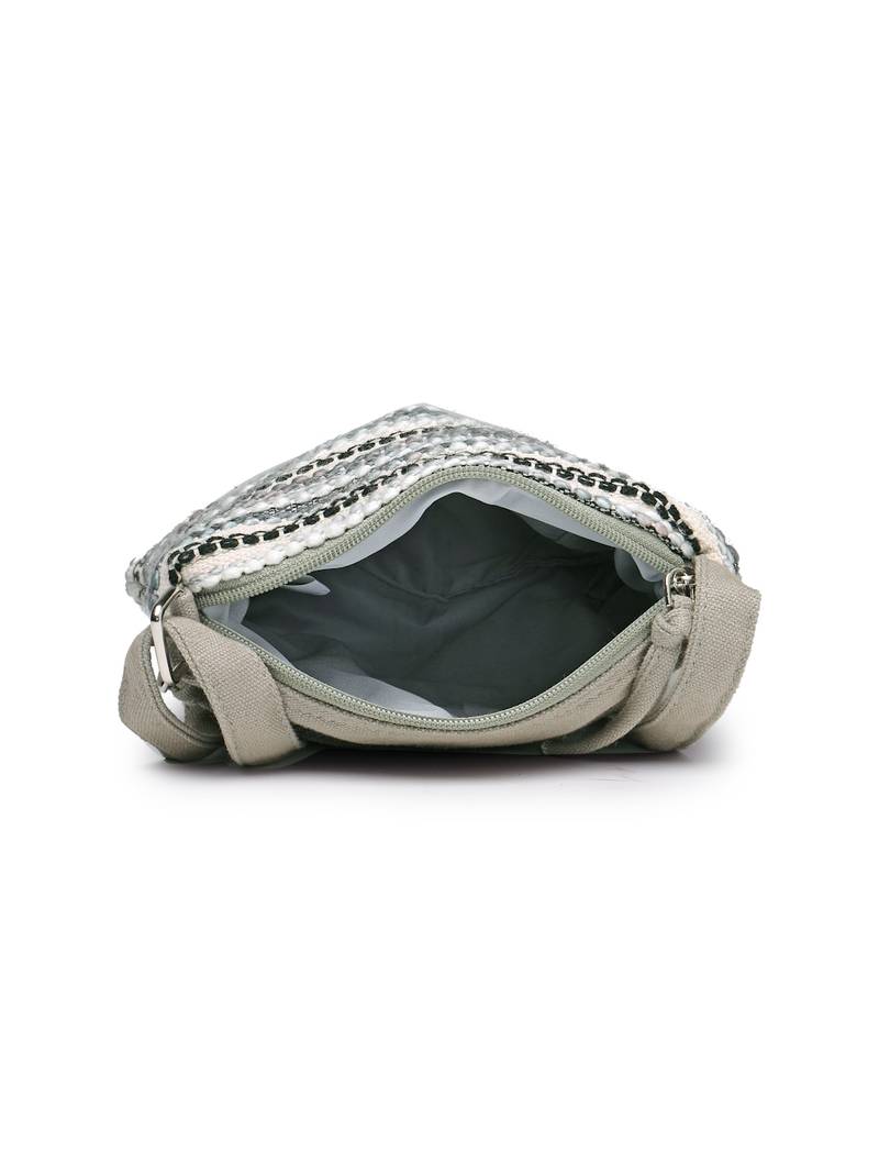 This Anekaant Sling Bag From The Lines & Loops Collection Features A Main Compartment Secured With A Zip Closure For Everyday Convenience. Designed In An Elegant Blend Of Grey, Ivory, And Black, It Offers A Refined And Contemporary Look. Crafted Fro M Acrylic Jacquard And Canvas And Finished With A Durable Polyester Lining, The Bag Showcases A Striped Woven Pattern Enhanced With Intricate Threadwork In Contrasting Hues. It Is Finished With An Inner Slip Pocket, Dual Front Zip Pockets For Organised Storage, And An Adjustable Strap For Versatile Styling. Dimensions (L × H × W): 20 × 24 × 2 Cm.
