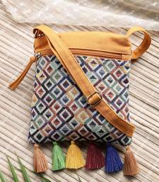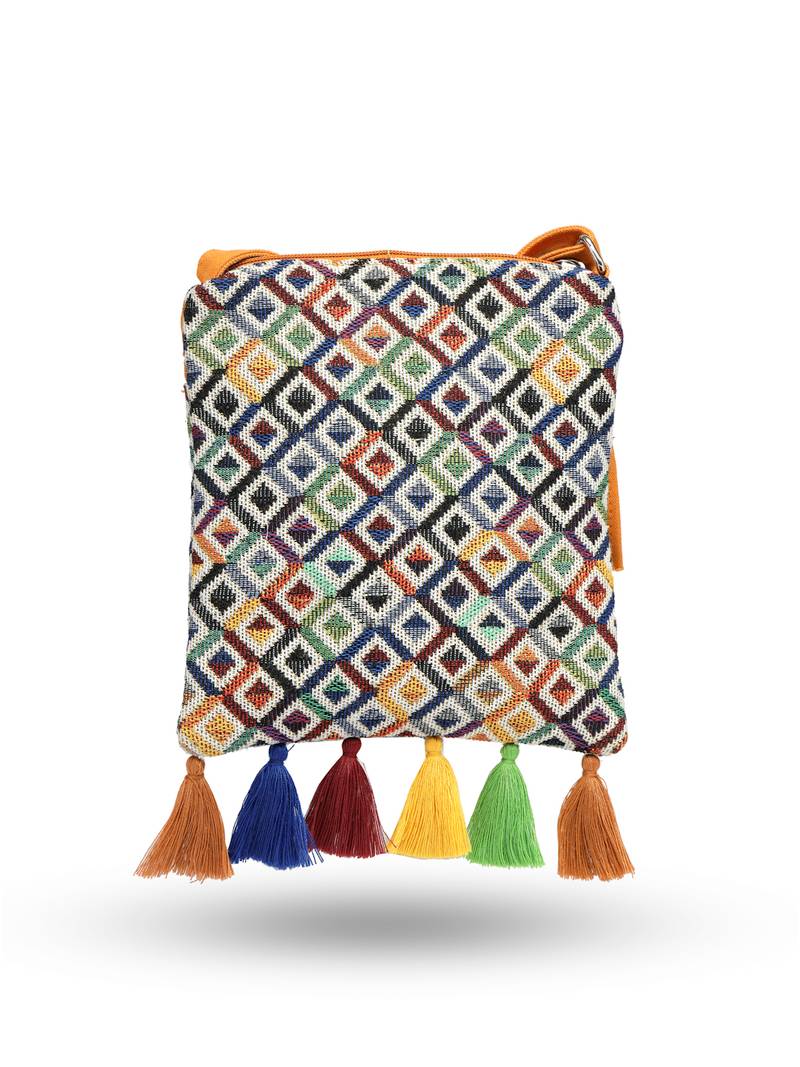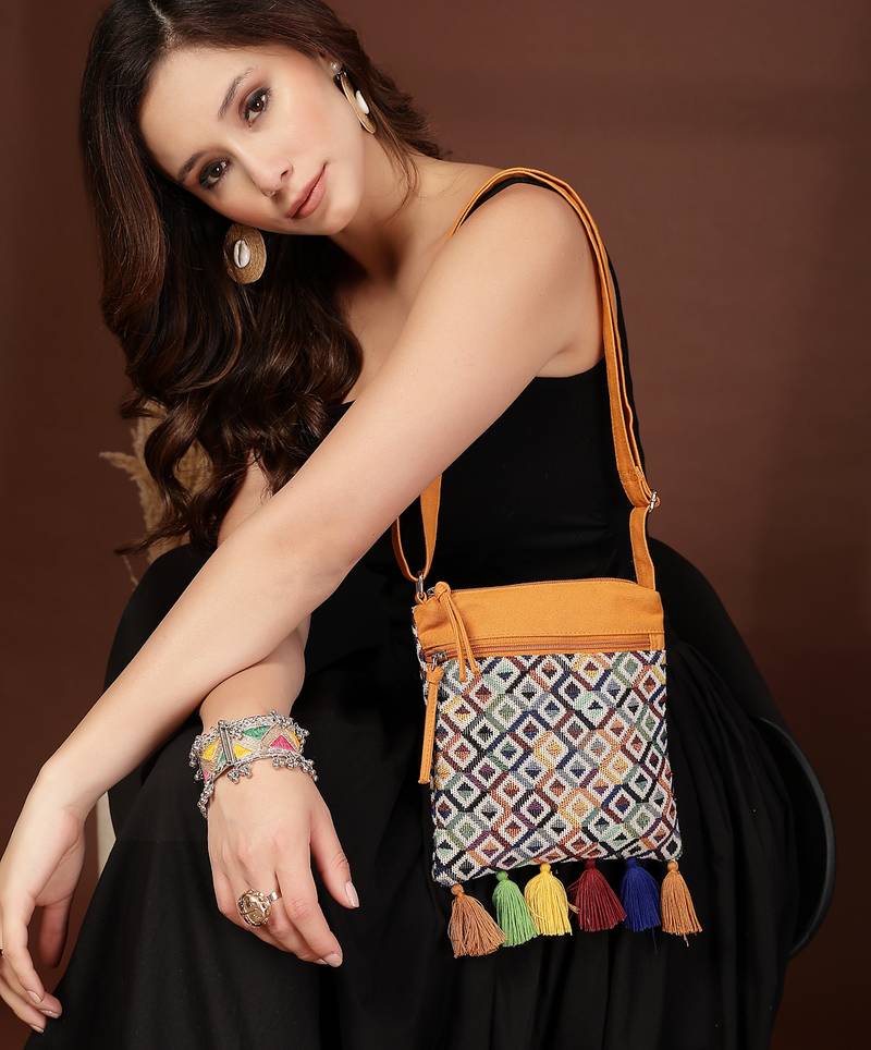 | Product Description | This Anekaant Sling Bag From The Lines & Loops Collection Features A Main Compartment Secured With A Zip Closure For Everyday Ease. Designed In A Mustard Base With Multicolour Woven Highlights, It Adds A Warm And Artisanal Touch. Crafted Using An Acrylic Jacquard Weave Paired With Canvas And Supported By A Durable Polyester Lining, The Bag Showcases A Geometric Diamond Pattern Enhanced With Multicolour Detailing And Tassel Accents. It Is Styled With An Inner Slip Pocket, A Front Zip Pocket For Easy Access, And An Adjustable Sling Strap. Dimensions (L × H × W): 20 × 23 × 2 Cm. |