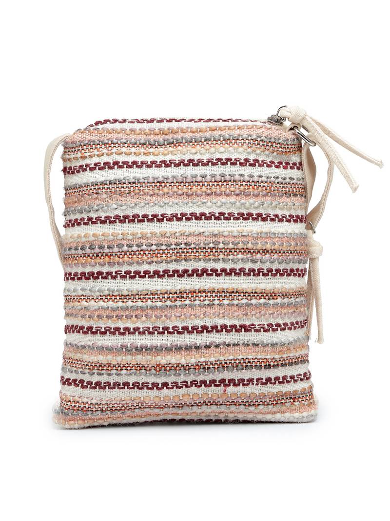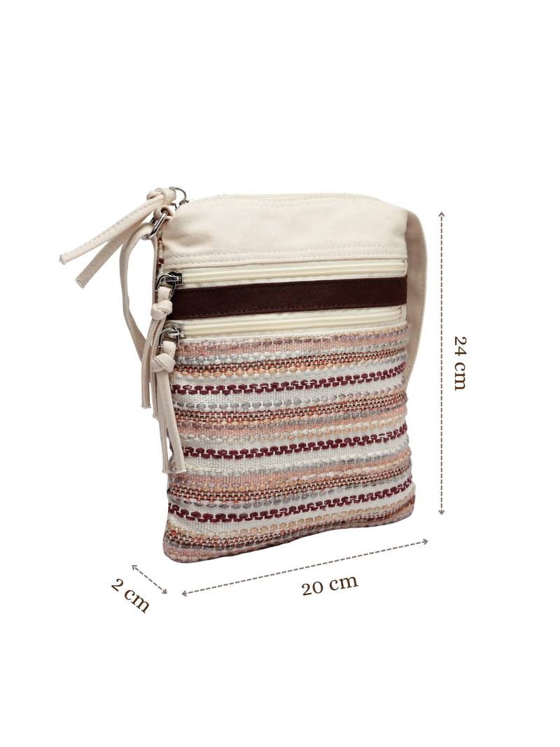 This Anekaant Sling Bag From The Lines & Loops Collection Features A Main Compartment Secured With A Zip Closure For Everyday Convenience. Designed With A Blush Base Accented By Soft Tones Of Peach, Mauve, And Ivory, It Delivers A Subtle Yet Contemporary Look. Crafted From Acrylic Jacquard And Canvas And Finished With A Durable Polyester Lining, The Bag Highlights A Striped Woven Pattern Enhanced With Detailed Threadwork In Contrasting Hues. It Is Finished With An Inner Slip Pocket, Dual Front Zip Pockets For Organised Storage, And An Adjustable Strap For Versatile Styling. Dimensions (L × H × W): 20 × 24 × 2 Cm.
