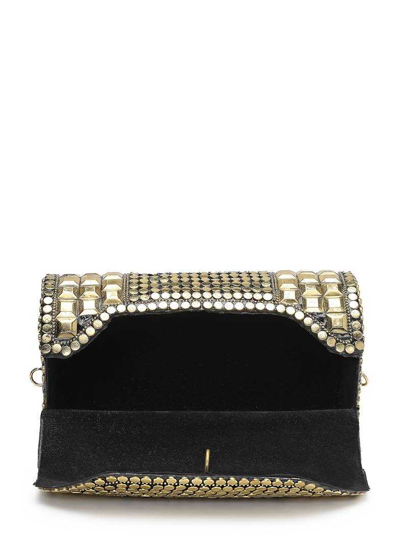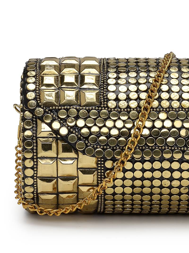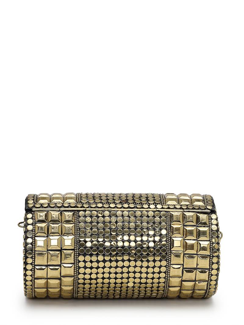 This Anekaant Clutch From The Metal Mirage Collection Is Styled In A Refined Cylindrical Silhouette With A Single Compartment Secured By A Reliable Click Lock Closure. Crafted With A Durable Hard Case And Enamel Base, It Features A Striking Black Surface Accented With Metallic Gold Highlights. The Design Showcases Circular Studs Arranged In Precise Rows, Framed By Square Pyramid Elements To Create Structured Geometric Panels. Finished With A Detachable Sling Strap, This Clutch Is A Statement Accessory Ideal For Weddings, Festive Occasions, And Evening Parties. Dimensions (L X H X W):18 X 10 X 9.5 Cm.