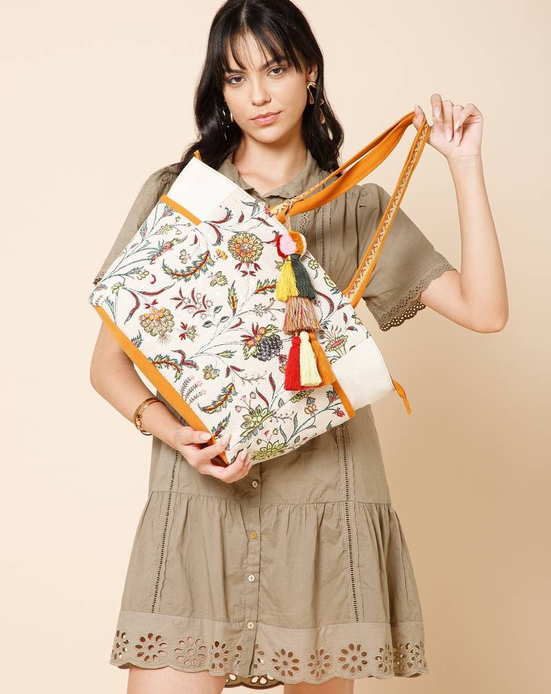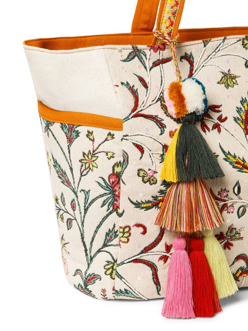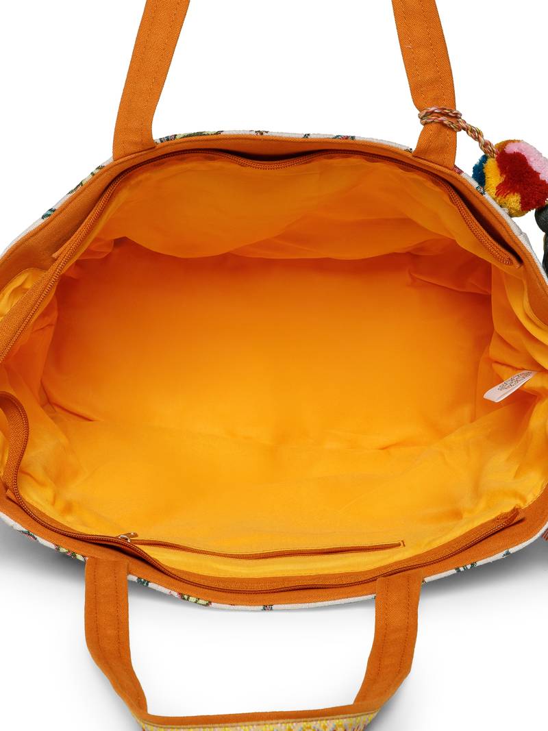 This Anekaant Tote Bag From The Petal Posh Collection Features An Ivory Base Adorned With Multicolored Floral Embroidery, Complemented By Orange Handles And Contrast Piping. Crafted From Woven Jacquard Fabric With A Sturdy Cotton Canvas Base, It Showcases Floral Thread Embroidery Enhanced With Sequins, Beads, And Mirror Embellishments For A Festive Touch. Measuring 33 X 30 X 15 Cm (L X H X W), This Tote Includes A Spacious Main Compartment With An Inner Zip Pocket, A Secure Back Zip Pocket, And Two Handles Finished With Decorative Woven Lace Trim For Added Style And Durability.