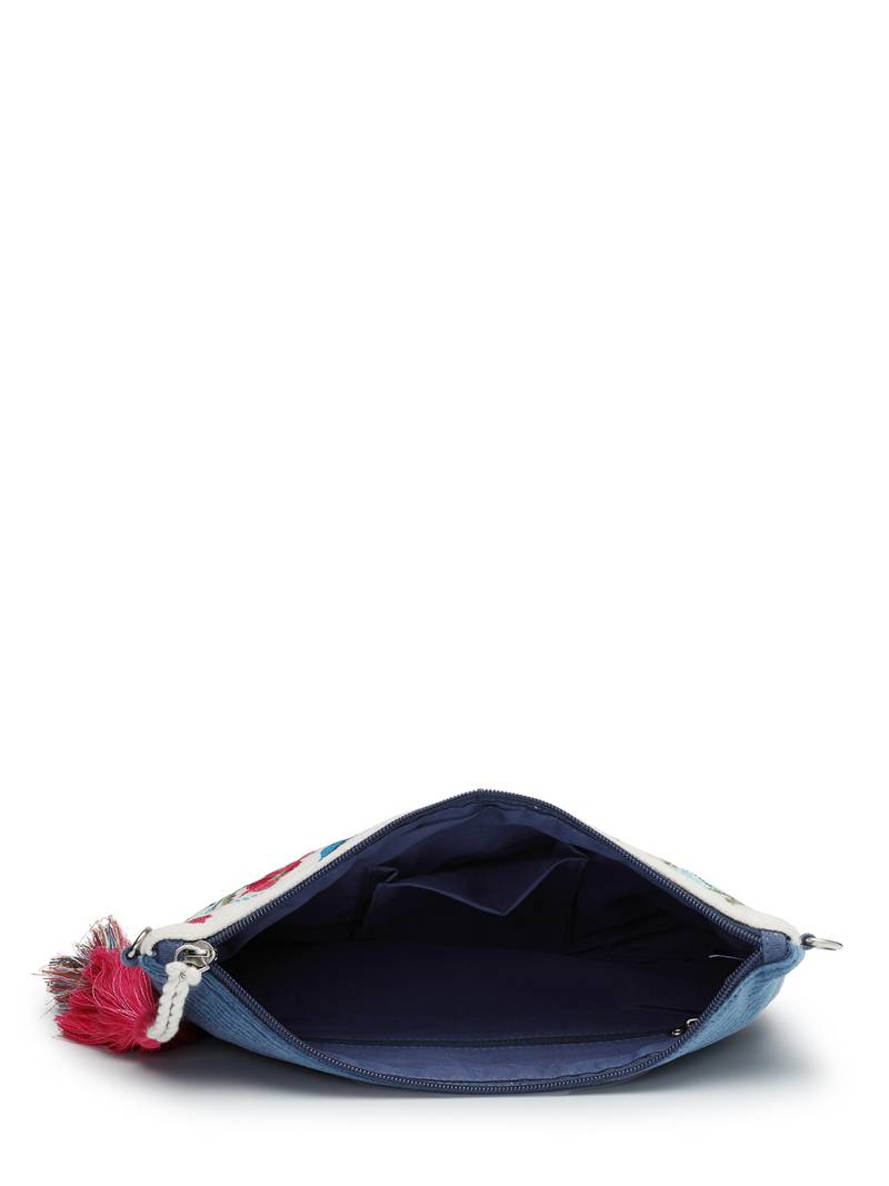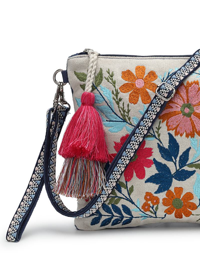 | Product Description | This Anekaant Sling Bag From The Thread Bloom Collection Is Crafted From Cotton Canvas And Corduroy With An Off White Base, Enriched By Multicolor Floral Embroidery In Pink, Orange, Red, Blue, And Green, Contrasted With A Solid Navy Back. Designed With A Single Main Compartment Secured By A Zip Closure, The Front Panel Highlights Bold Blossoms And Leafy Vines For A Vibrant Botanical Appeal. The Interior Includes An Inner Zip Pocket And A Slip Pocket For Essentials, While The Design Is Completed With A Detachable Wrist Loop And An Adjustable Embroidered Sling Strap Finished With A Matching Tassel. Dimensions (L X H X W): 28 X 21 X 2 Cm. Style : Thread Bloom Sling Bag With A Single Main Compartment Secured By A Zip Closure.
