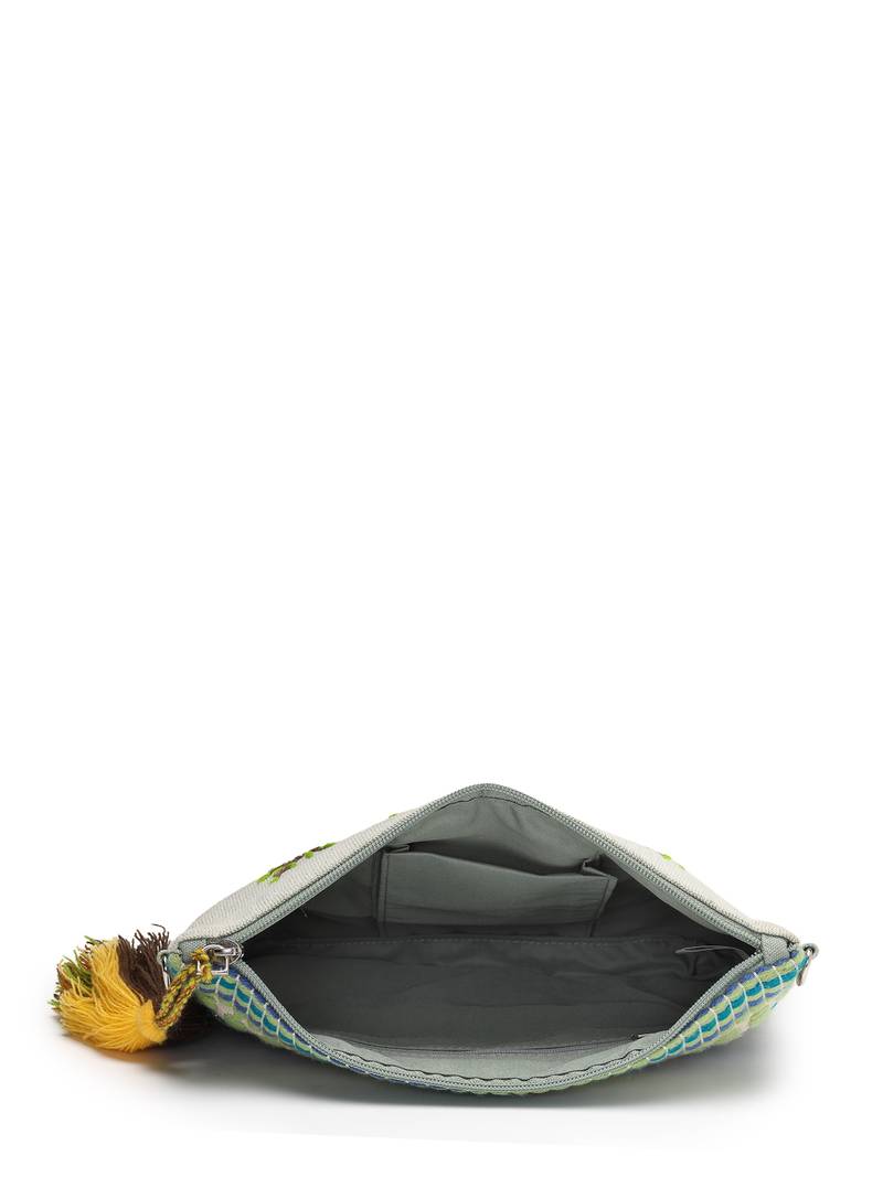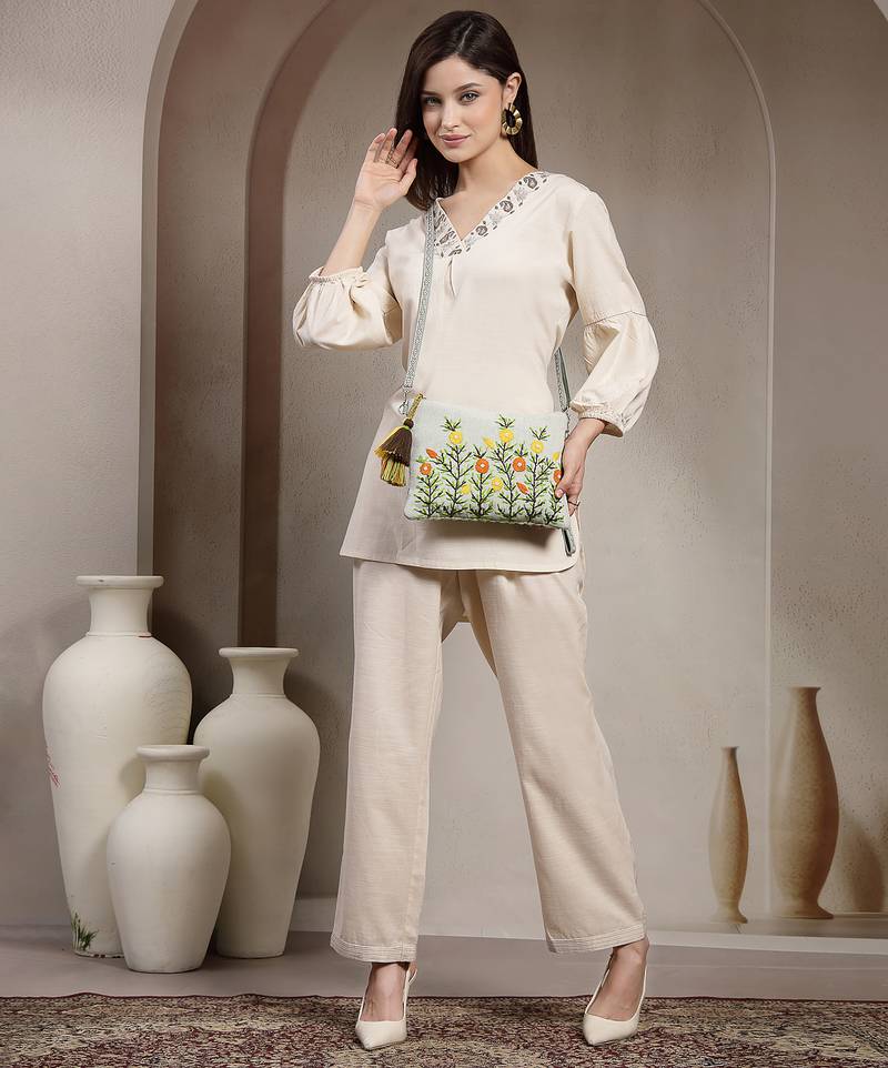 This Anekaant Sling Bag From The Thread Bloom Collection Is Crafted From Cotton Canvas And Acrylic Jacquard With A Light Pastel Green Base, Highlighted By Multicolor Embroidery In Yellow, Orange, And Brown. The Front Panel Showcases Hand Embroidered Floral Motifs, While The Back Contrasts With A Geometric Stripe Pattern For Versatile Styling. The Interior Includes Both A Zip Pocket And A Slip Pocket For Convenience, While Dual Carrying Options Are Provided Through A Detachable Wrist Loop And An Adjustable Detachable Sling Strap, Refined With Tassel Detailing. Dimensions (L X H X W): 28 X 32 X 13 Cm.