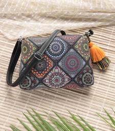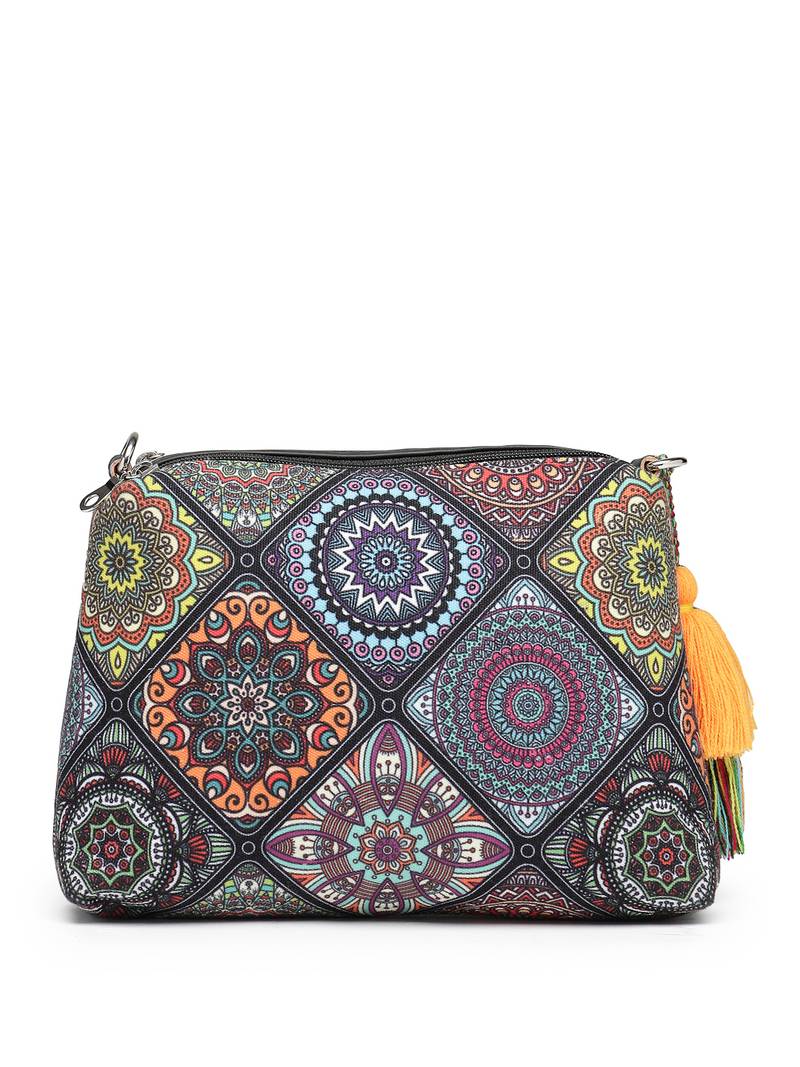 | Product Description | This Anekaant Sling Bag From The Tile Trip Collection Is Designed With Dual Main Compartments, Both Secured With Zip Closures For Organised Storage. Styled In A Black Base Balanced With Vibrant Multicolour Detailing, It Offers A Bold And Artistic Appeal. Crafted From Polycotton Canvas And Pu For The Exterior And Finished With A Strong Polyester Lining, The Bag Showcases A Multicolour Mandala Inspired Design Combined With Geometric Elements. It Is Styled With An Inner Zip Pocket For Essentials And An Adjustable, Detachable Sling Strap Detailed With Matching Tassels For Versatile Wear. Dimensions (L × H × W): 26 × 17 × 5 Cm. |