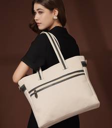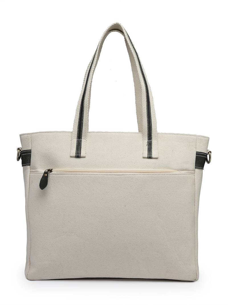 This Anekaant Tote Bag From The Timber & Thread Collection Is Thoughtfully Designed To Balance Everyday Functionality With Refined Style. Crafted In A Classic Off White Base, It Is Elevated With Contrasting Olive Strap Accents And A Sleek Front Zip Detail That Adds A Modern Edge To Its Solid Design. Constructed Using A Durable Blend Of Cotton Canvas And Genuine Crackle Leather, The Tote Is Finished With A Resilient Polyester Lining For Long Lasting Use. It Features A Spacious Main Compartment Secured With A Smooth Zipper Closure, Along With A Dedicated Tablet/Laptop Compartment That Fits Devices Up To 14 Inches And Fastens Securely With A Velcro Closure. Additional Storage Includes A Front Zip Pocket For Quick Access, An Inner Mobile Pocket For Essentials, And A Back Zip Pocket To Keep Valuables Safe. Designed For Versatile Carrying, The Bag Comes With Two Elegant Lace Trimmed Handles And An Adjustable, Detachable Sling Strap,Making It Suitable For Work, Travel, Or Daily Outings. Dimensions (L × H × W): 37 × 33 × 9 Cm