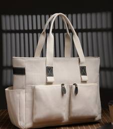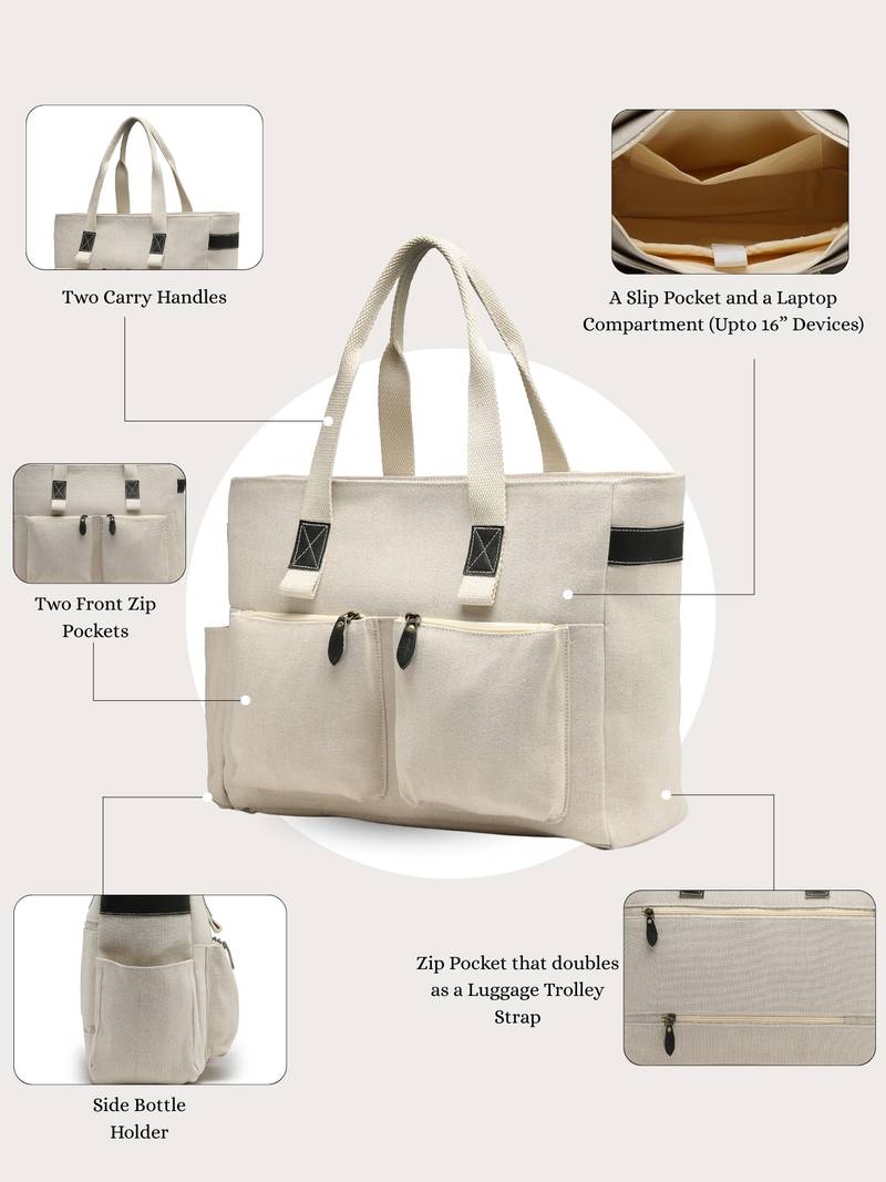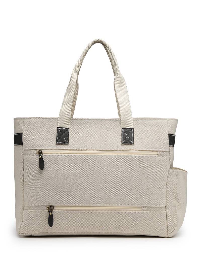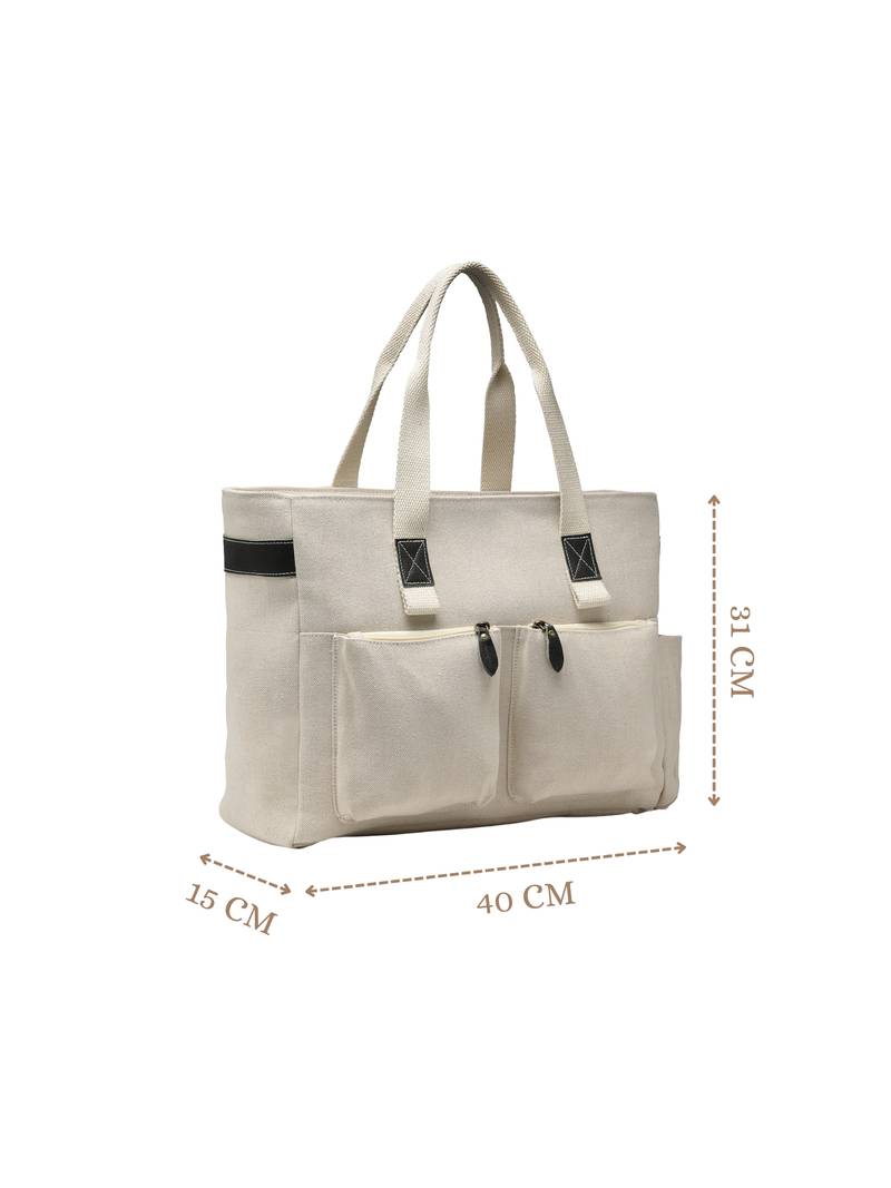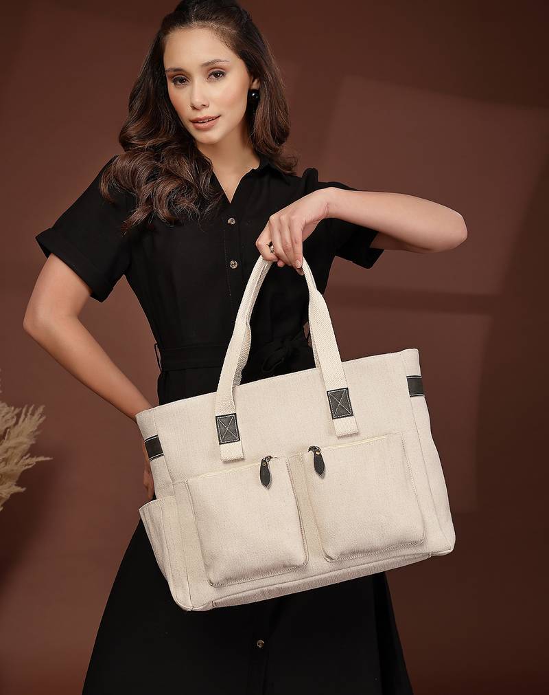 This Anekaant Tote Bag From The Timber & Thread Collection Is Designed For Effortless Everyday Utility With A Refined, Minimal Aesthetic. Crafted In A Natural Off White Base, It Is Complemented By Contrasting Olive Handles And Zipper Pull Accents, Giving The Bag A Crisp And Modern Look. The Solid Surface Is Enhanced With Precision Stitching And Thoughtfully Placed Utility Pockets, Keeping The Design Sleek Yet Practical. Made From A Durable Combination Of Crackle Leather And Jute Cotton, The Tote Is Finished With A Resilient Polyester Lining For Long Lasting Performance. It Features A Spacious Single Main Compartment Secured With A Zipper Closure, Along With A Velcro Fastened Tablet Or Laptop Compartment That Fits Devices Up To 16 Inches. Functional Details Include Two Front Zip Pockets For Quick Access, A Side Bottle Holder, An Inner Slip Pocket For Daily Essentials, And A Back Zip Pocket That Conveniently Doubles As A Trolley Luggage Strap,Making It Ideal For Work, Travel, And On The Go Lifestyles. Designed For Comfortable Carrying, The Bag Comes With Two Sturdy Carry Handles. Dimensions (L × H × W): 40 × 31 × 15 Cm