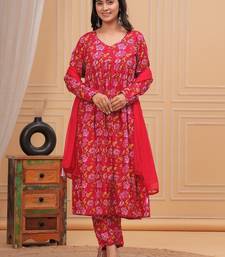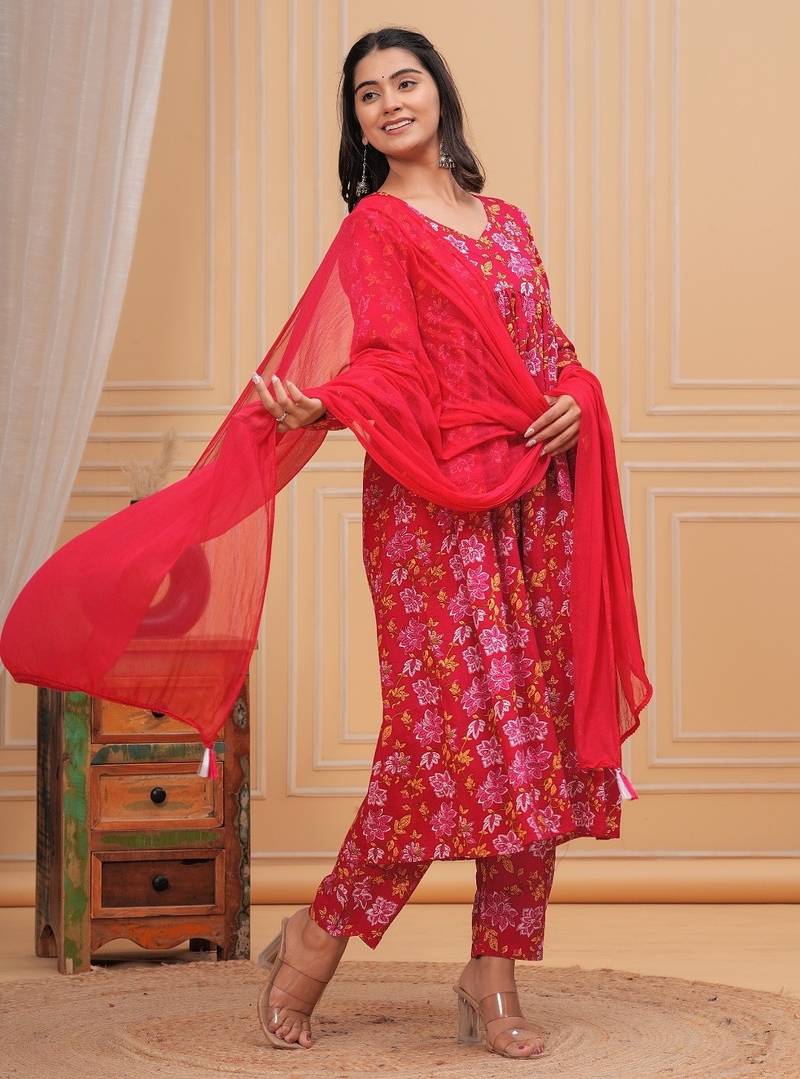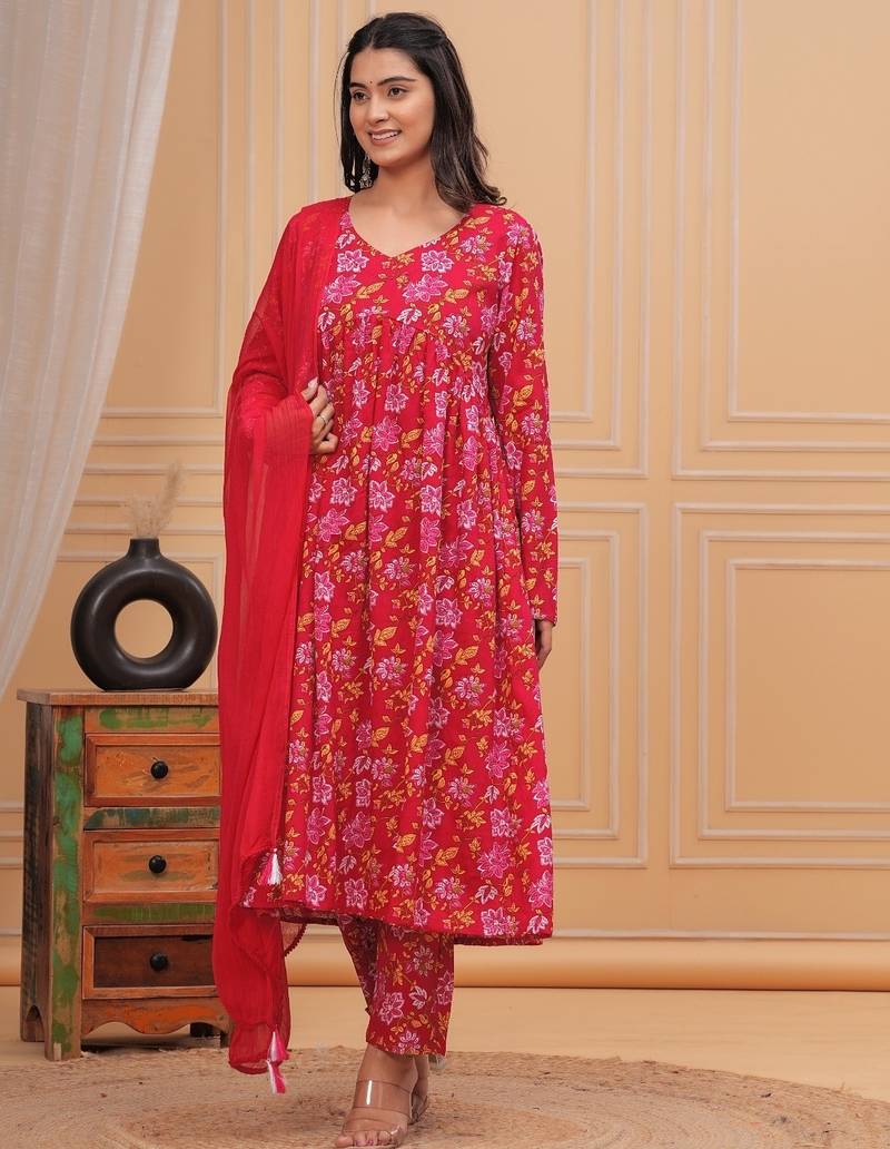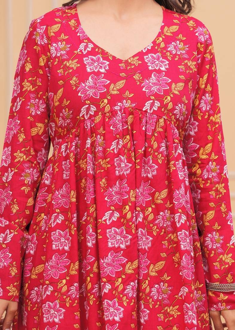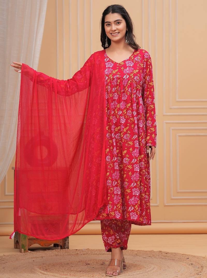 This Stunning Women's Pink Anarkali Kurta Set Features A Vibrant Floral Print That Brings A Touch Of Elegance And Charm To Your Ethnic Wardrobe. The Beautiful V Neckline And Full Sleeves Create A Graceful Silhouette, Whilst The Flowing Anarkali Style Offers Both Comfort And Sophistication. The Rich Pink Base Is Adorned With Delicate Pink, Yellow, And Multicoloured Floral Motifs That Create An Eye Catching Pattern Throughout The Ensemble. This Complete Three Piece Set Includes A Matching Printed Pant And A Coordinating Pink Dupatta, Making It Perfect For Festive Occasions, Celebrations, Or Special Gatherings. The Comfortable Fit And Breathable Fabric Ensure You Stay At Ease Throughout The Day, Whilst The Traditional Design Keeps You Looking Stylish. The Matching Pant Complements The Kurta Beautifully, And The Dupatta Adds An Extra Layer Of Elegance To Complete Your Look. Whether You're Attending A Family Function, Religious Ceremony, Or Cultural Event, This Anarkali Kurta Set Will Make You Stand Out With Its Vibrant Colours And Intricate Floral Design. Style It With Traditional Jhumkas And Mojaris For An Authentic Ethnic Appearance.
