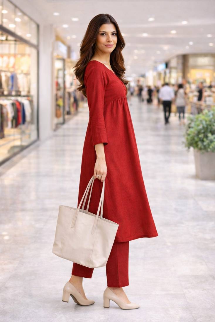 Elevate Your Ethnic Wardrobe With This Sophisticated Olive Green Anarkali Kurta And Pant Set. The Kurta Features An Elegant V Neckline Adorned With Decorative Buttons Down The Front, Creating A Refined Look. The Empire Waistline Flows Into Beautiful Pleats That Add Graceful Movement And Volume To The Silhouette. Crafted With Three Quarter Length Sleeves, This Ensemble Offers Both Style And Comfort. The Coordinating Pants Complete The Look With Their Relaxed Fit And Contemporary Appeal. Perfect For Both Casual Gatherings And Festive Occasions, This Set Combines Traditional Design Elements With Modern Styling. The Versatile Colour Palette Makes It Easy To Accessorise, While The Comfortable Cut Ensures Unrestricted Movement Throughout The Day. This Ensemble Is Ideal For Various Body Types And Can Be Styled With Traditional Jewellery And Footwear To Create Multiple Looks.
