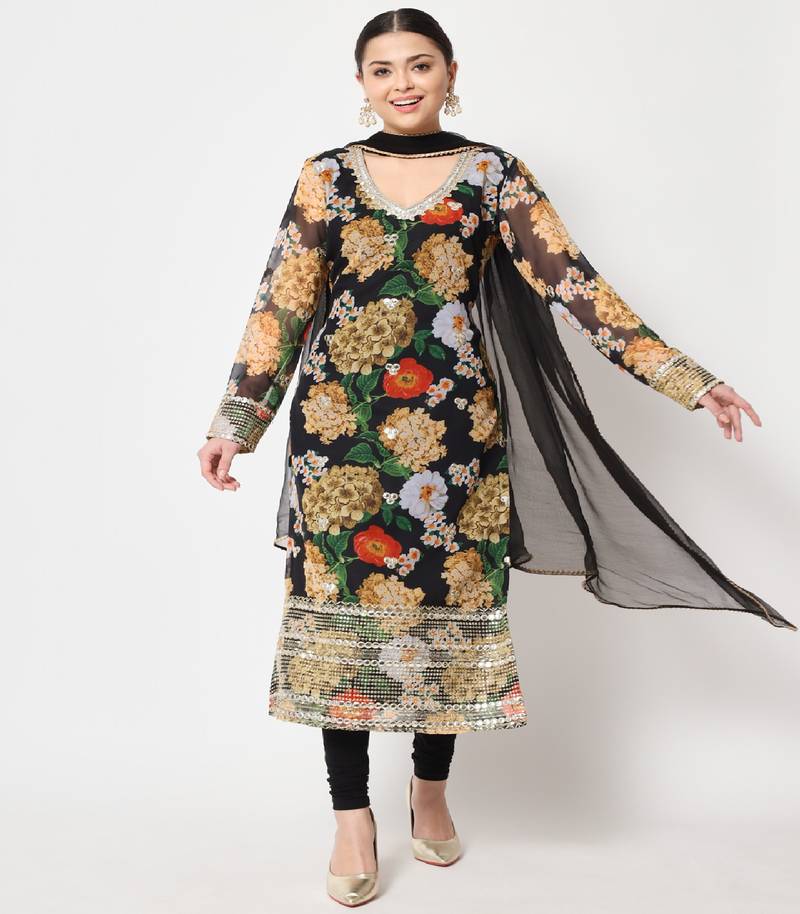 | Product Description | Florals Can Never Go Wrong, Try This Lovely Black Floral Printed Embroidered Kurti With Churidaar And Dupatta, Kurti Printed With Big Floral Design And Embellished With Zari And Mirror Work On The Hemline And The Sleeves. A Straight Long Kurta Paired Up With Chudidar And A Matching Chiffon Dupatta, A Pair Of Gold Heels And Some Danglers Will Complete The Whole Look. |
