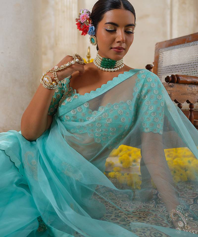 | Product Description | Elegant Blue Embroidered Organza Saree Crafted In A Lightweight, Sheer Fabric With A Soft Natural Sheen. Intricate Embroidery Adds Delicate Charm And Festive Elegance, While The Graceful Drape Creates A Refined Silhouette. Perfect For Weddings, Festive Celebrations, Parties, And Sophisticated Evening Occasions.