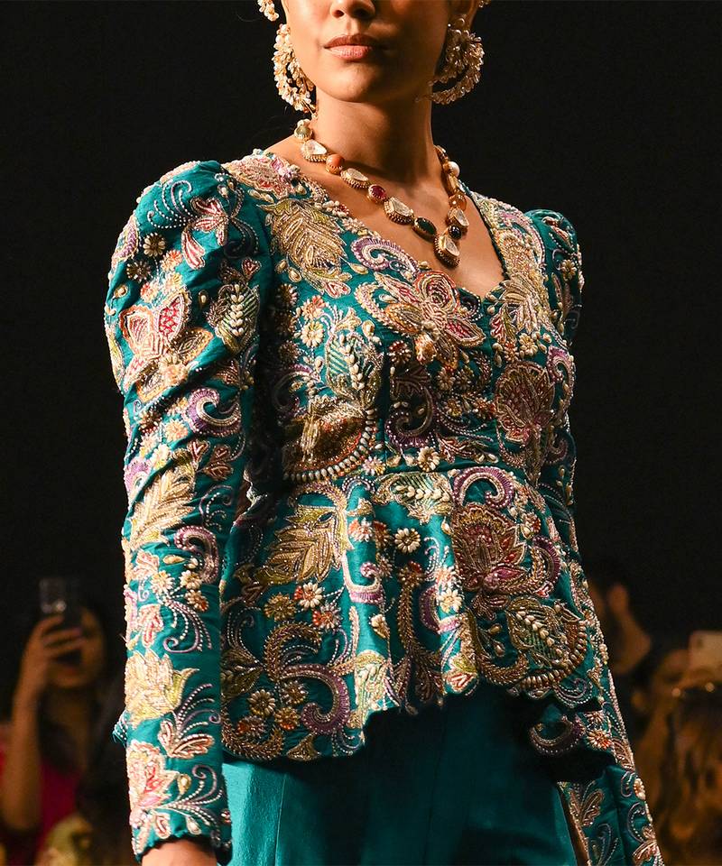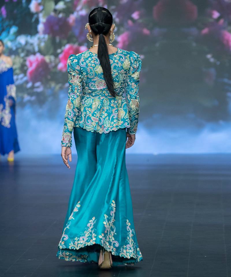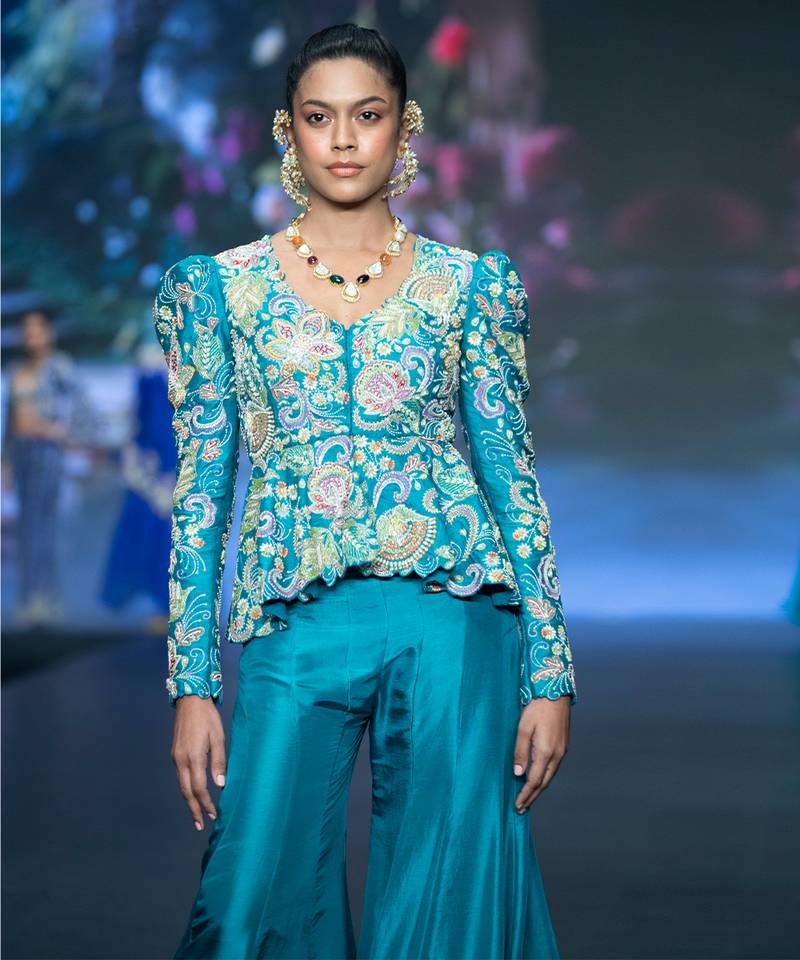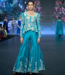 Blue embroidered rawsilk sharara set