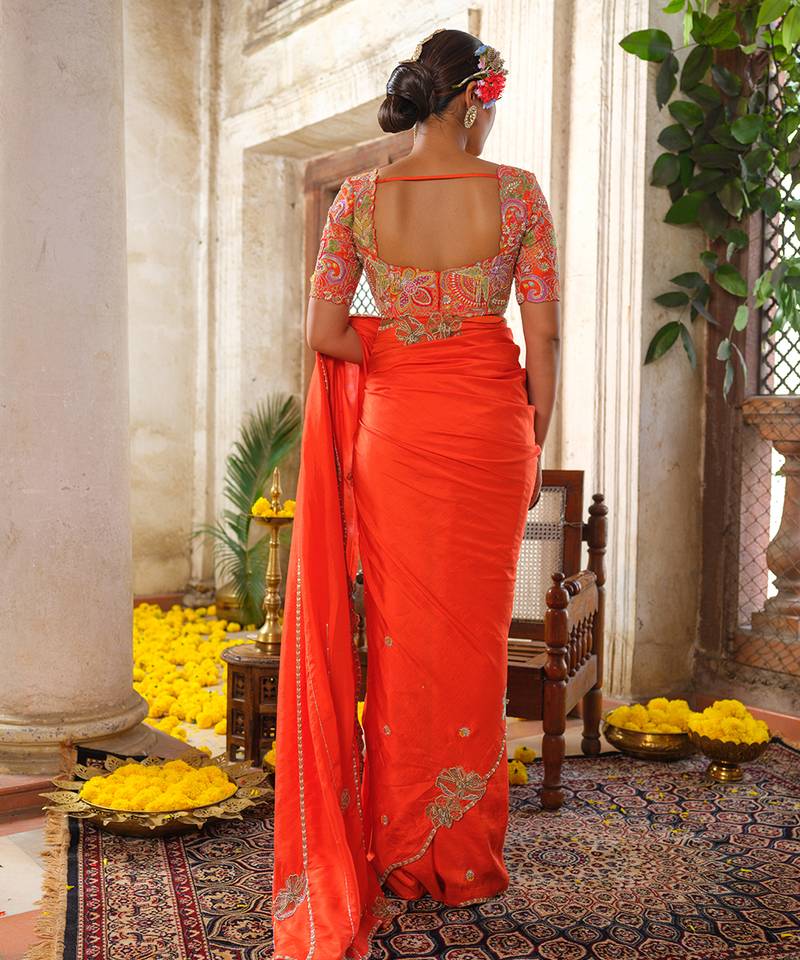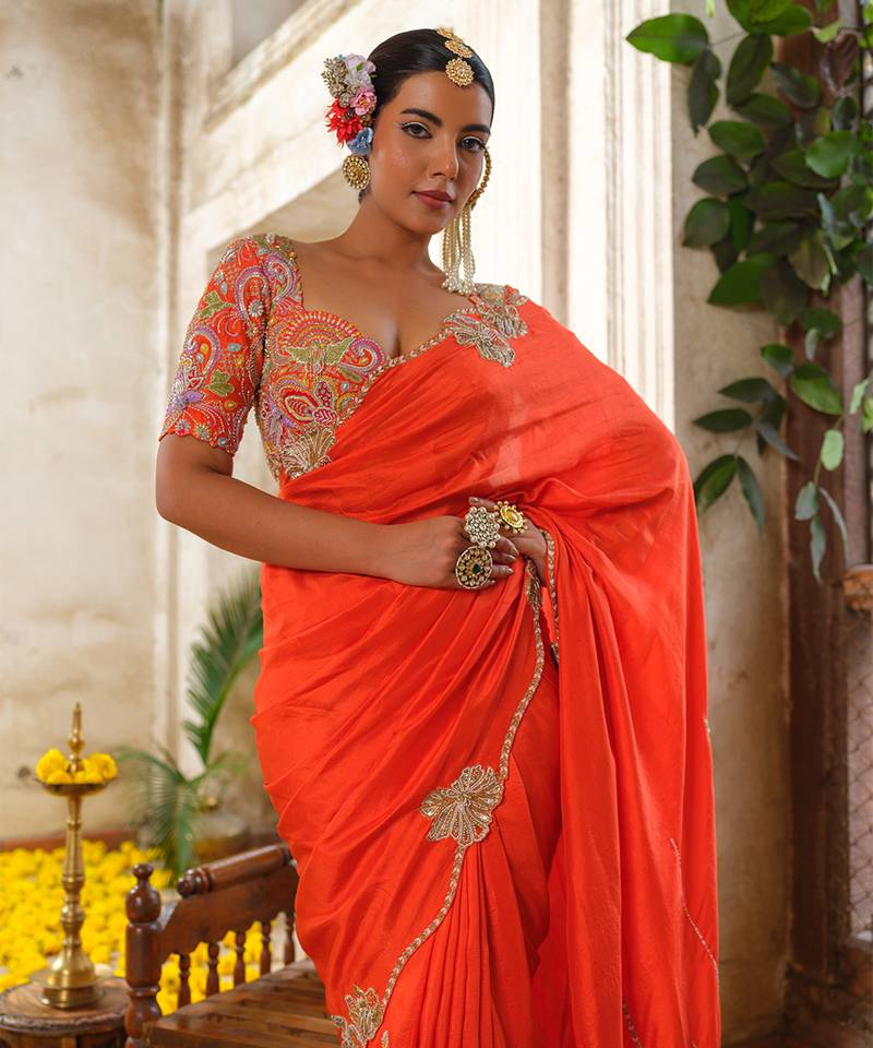 Orange embroidered silk saree