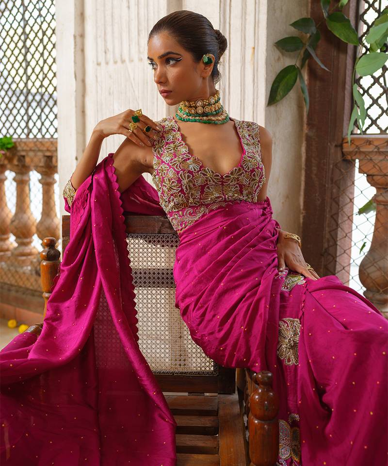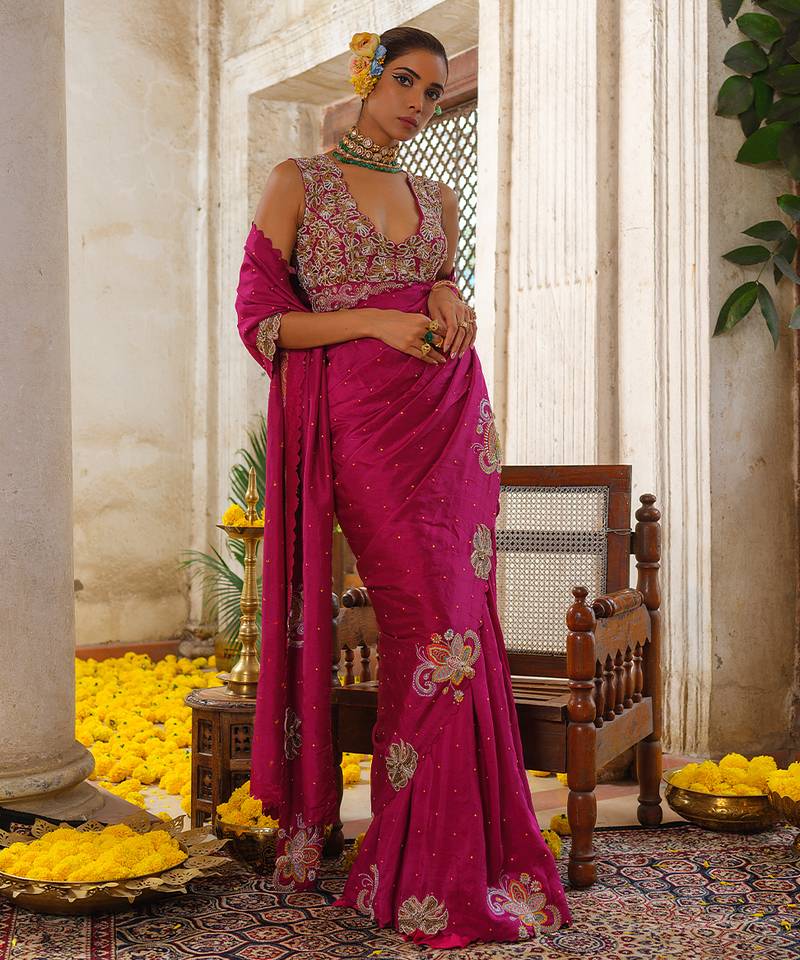Pink embroidered silk saree