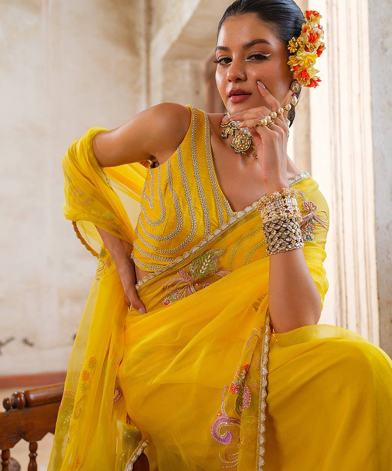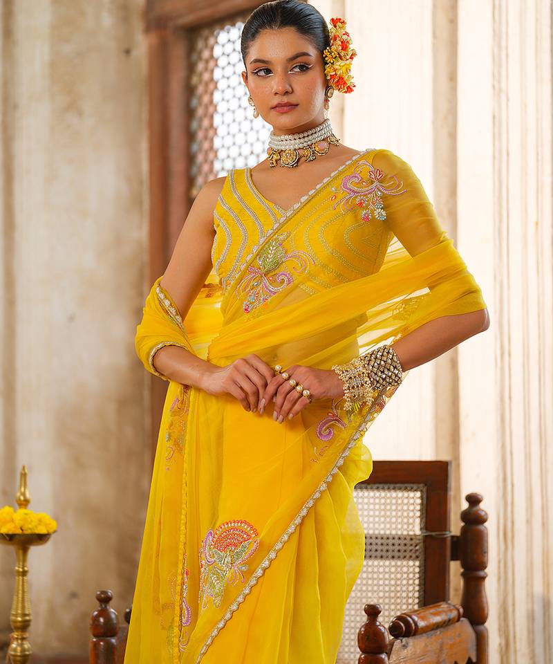 | Product Description | Radiant Yellow Embroidered Organza Saree Crafted In A Lightweight, Sheer Fabric With A Soft Natural Sheen. Intricate Embroidery Adds Festive Charm And Delicate Elegance, While The Graceful Drape Creates A Refined Silhouette. Perfect For Weddings, Festive Celebrations, Daytime Parties, And Special Occasions.