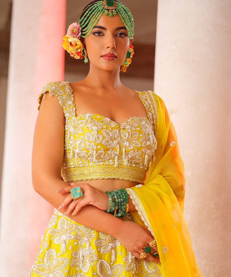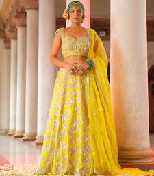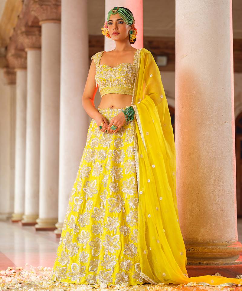 Yellow embroidered silk lehenga set