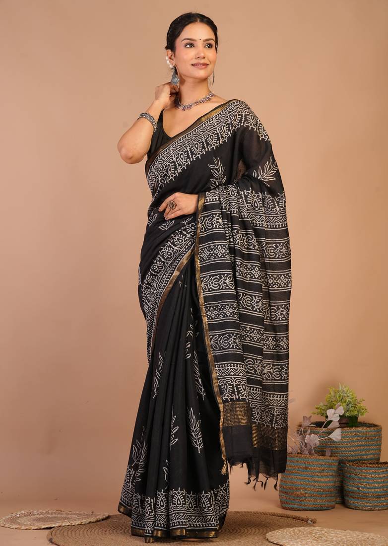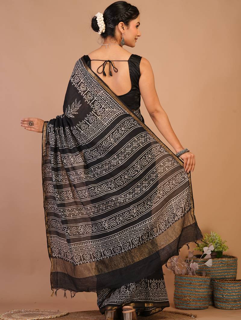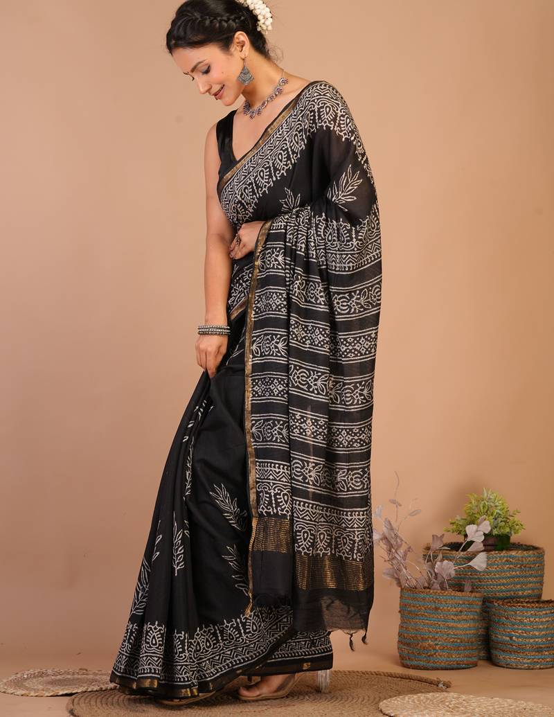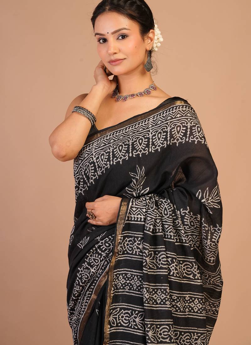 | Product Description | A Timeless Blend Of Tradition And Style, This Saree Is Perfect For The Modern Woman Who Loves To Celebrate Heritage With Bold Sophistication.The Deep Black Shade Exudes Mystery And Power, Beautifully Contrasted By Intricate Floral Hand Block Prints That Showcase Exquisite Craftsmanship. A Delicate Golden Zari Border Adds A Regal Shimmer, While Elegant Zari Embellishments And Playful Tassels Bring A Festive Charm To The Ensemble. |
